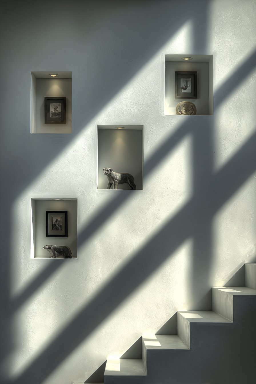 The symmetrical versus asymmetric arrangements represented in these concepts show how compositional strategy affects spatial perception and aesthetic impact. The symmetrical bathroom niches flanking freestanding tubs create formal balance and visual harmony appropriate to luxury bathroom design. The asymmetric living room feature wall niches generate dynamic energy and contemporary edge through varied sizes and positions. The graduated stairway niches create progressive rhythm that complements upward movement while preventing visual monotony. These compositional approaches demonstrate how arrangement strategy can reinforce or contrast with surrounding architectural elements.