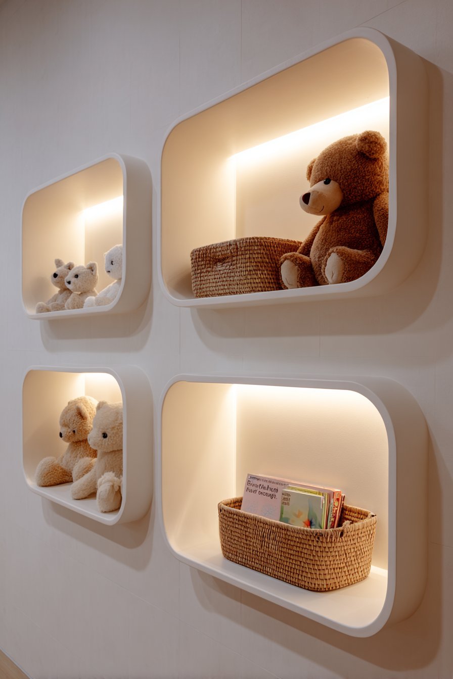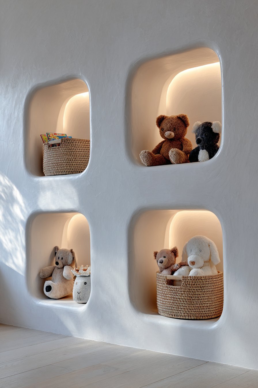 The spatial efficiency demonstrated throughout these niche concepts addresses one of modern life’s most pressing challenges—maximizing function within limited square footage. The vertical orientation of entryway coat storage eliminates the need for freestanding furniture while providing hooks and shelving within a narrow wall thickness. The grid-pattern home office niches organize supplies above the desk, keeping work surfaces clear without consuming precious desktop real estate. The child-height nursery niches provide accessible toy storage that encourages independence without requiring floor space for bins or shelving units. This strategic use of otherwise underutilized wall cavity space creates storage and display opportunities without sacrificing room to move and live comfortably.