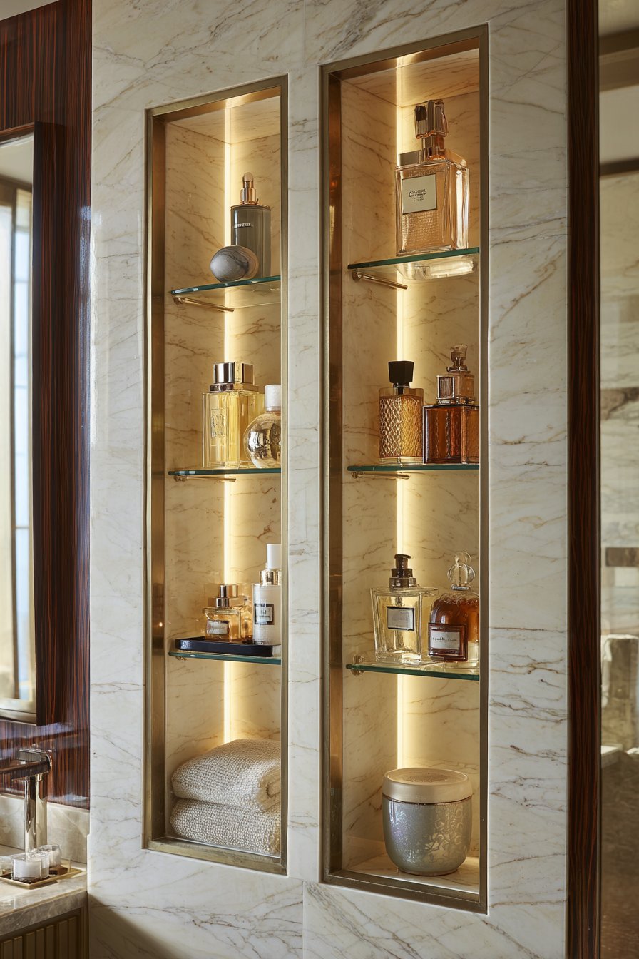 Warm LED strip lighting integrated along the vertical edges of each niche creates an ambient glow that transforms the bathroom into a relaxation haven during evening soaks. This indirect lighting strategy avoids harsh overhead illumination while providing enough visibility for safe navigation and creating a soft, flattering atmosphere conducive to unwinding. The marble-look porcelain tiles extend seamlessly into the niche interiors, maintaining the luxurious material palette throughout the space and reinforcing the high-end aesthetic.