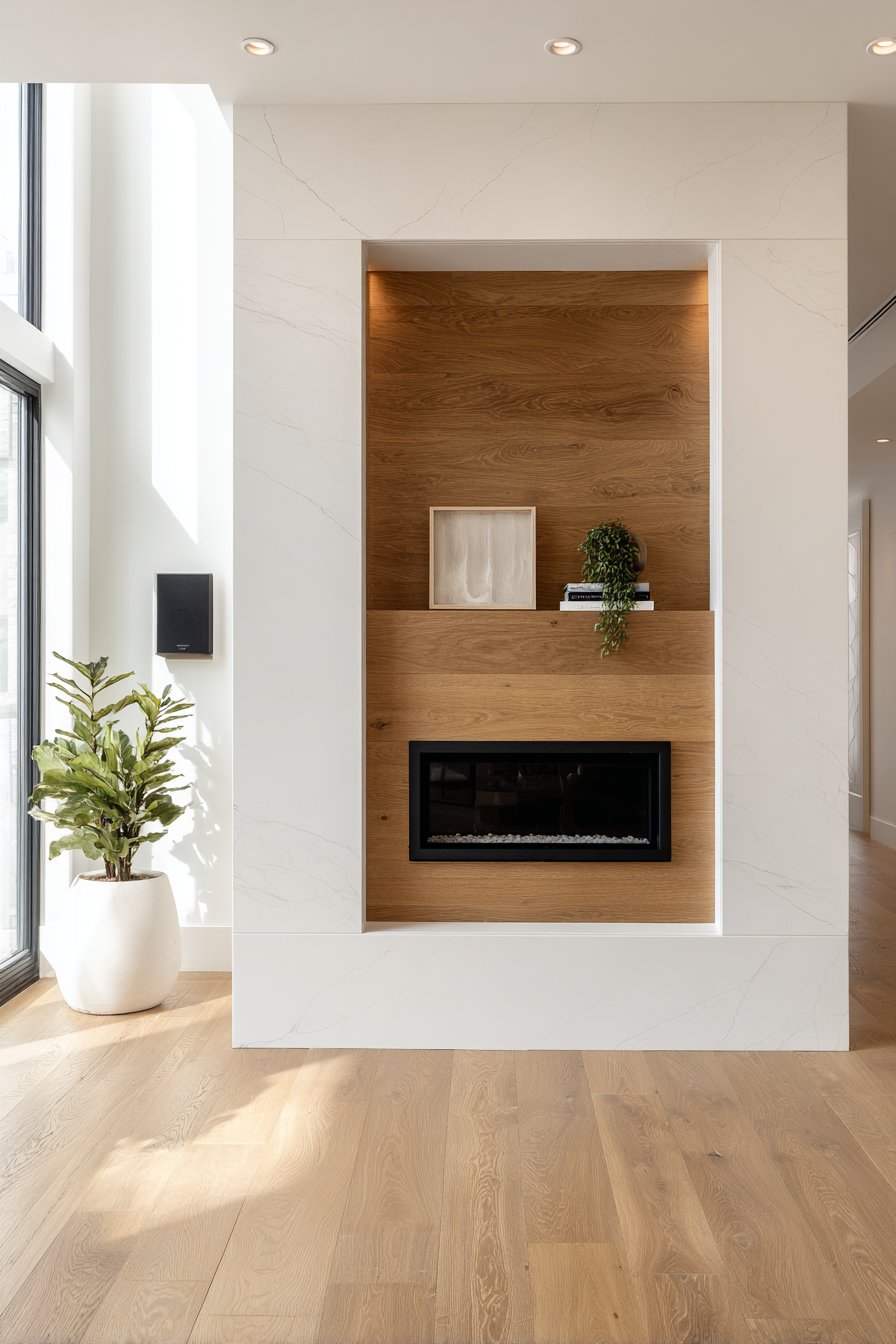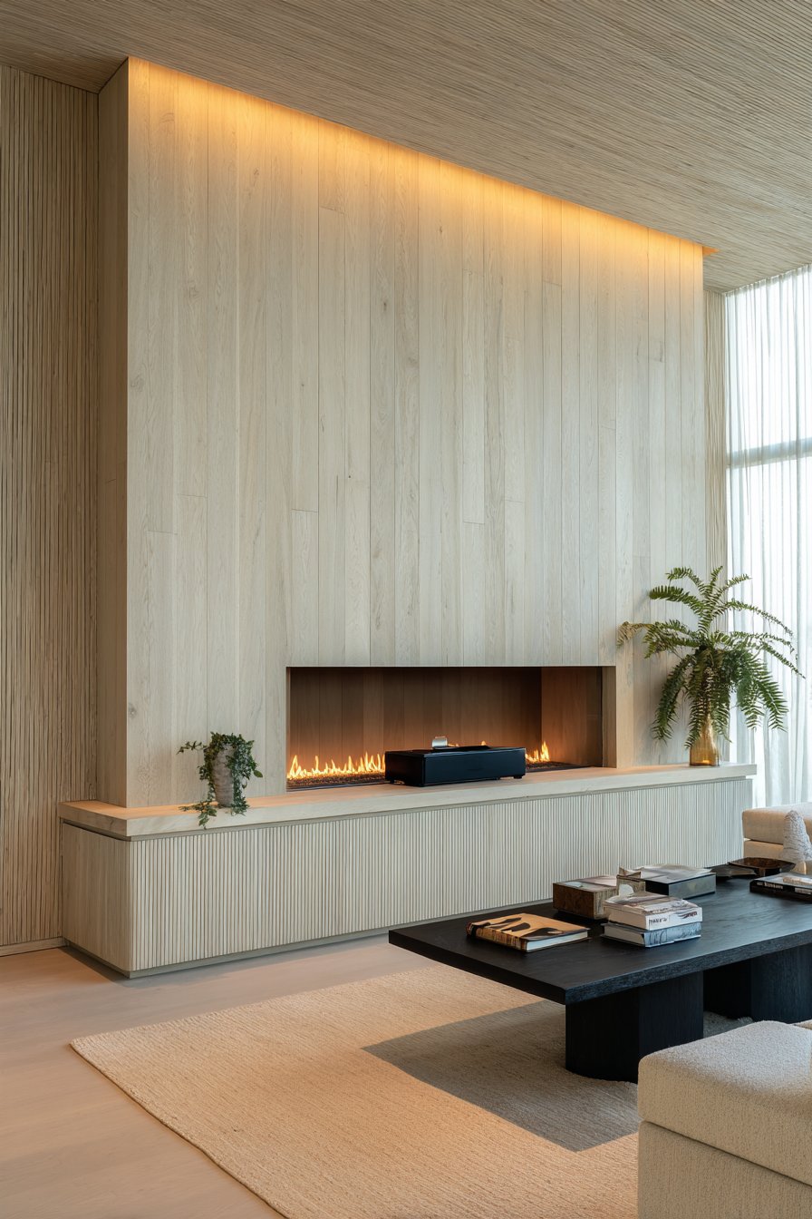 24. Contemporary Living Room Fireplace with Flanking Firewood Storage