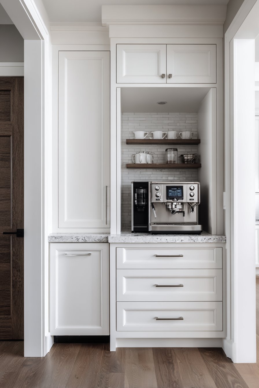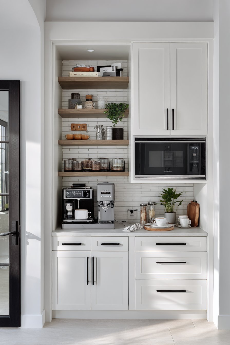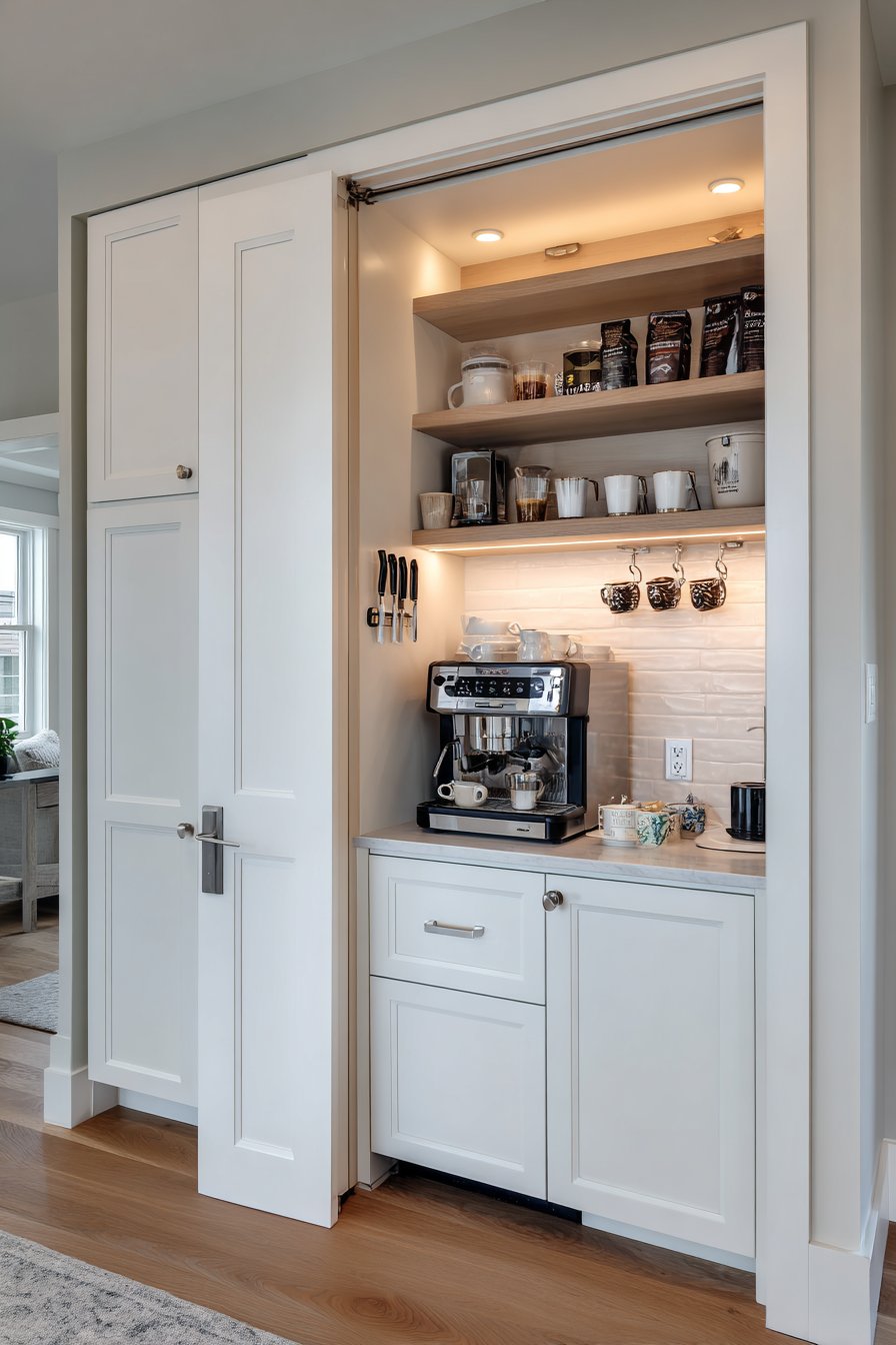 - Consider adding a small towel bar or hooks for hanging coffee scoops and dish towels