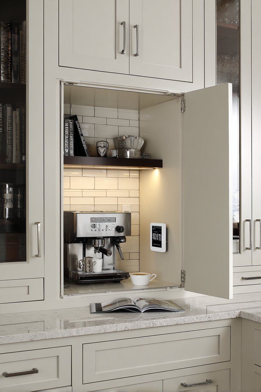 - Include a small pull-out shelf or drawer below for coffee supplies and accessories