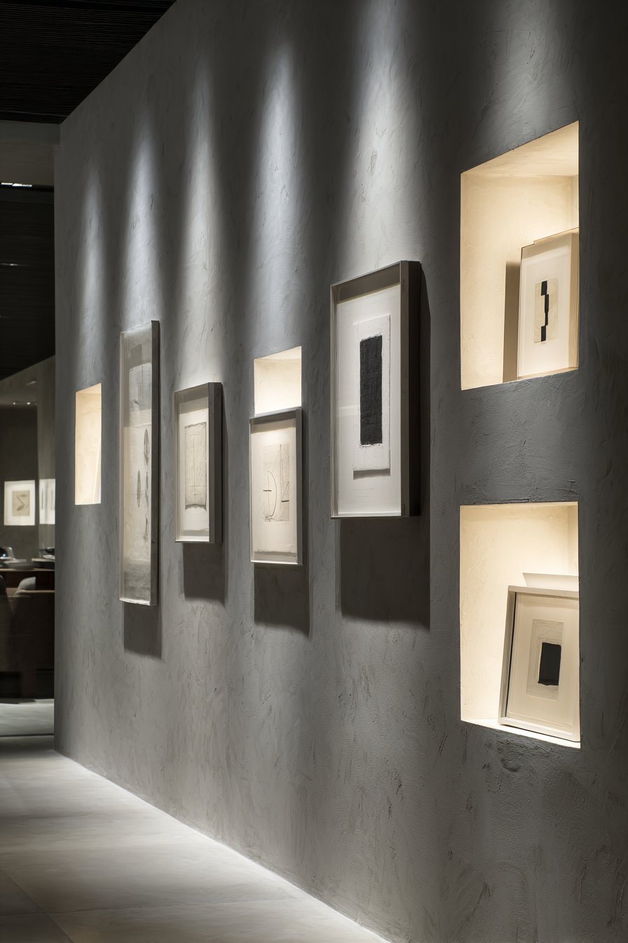 Museum-quality LED spotlights installed at the top of each niche cast focused illumination that highlights artwork while creating dramatic shadows that emphasize the dimensional depth of the recesses. This professional lighting approach transforms casual display into serious presentation, elevating personal photographs and collected art into museum-worthy exhibits. The gray plaster walls provide a sophisticated neutral backdrop that allows artwork to shine without color competition, while the smooth finish ensures nothing distracts from the displayed pieces.