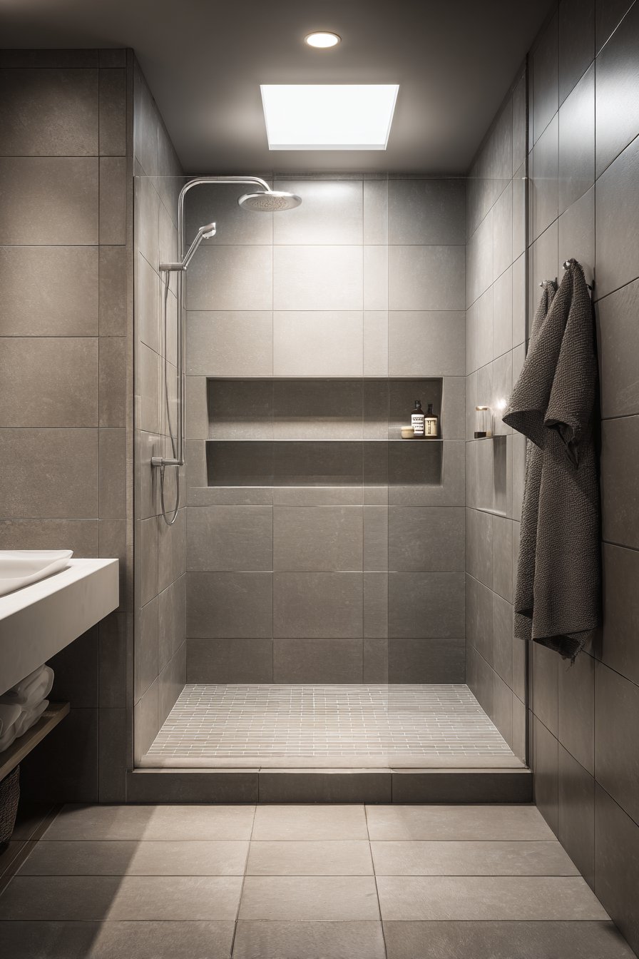The modern shower experience reaches new levels of convenience and style with strategically placed recessed wall niches built directly into gray porcelain tile walls. These three horizontal niches of varying widths provide practical storage for shampoo bottles, soap, conditioners, and bath accessories while eliminating the clutter of hanging caddies or corner shelves. The genius of this design lies in its integration into the shower’s permanent structure—what was once an afterthought becomes an intentional architectural element that enhances both function and aesthetic appeal.