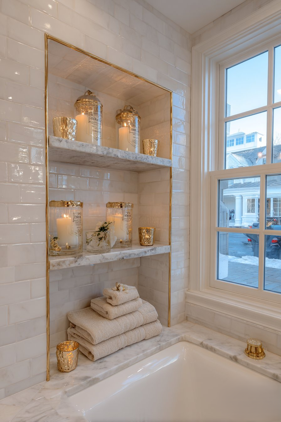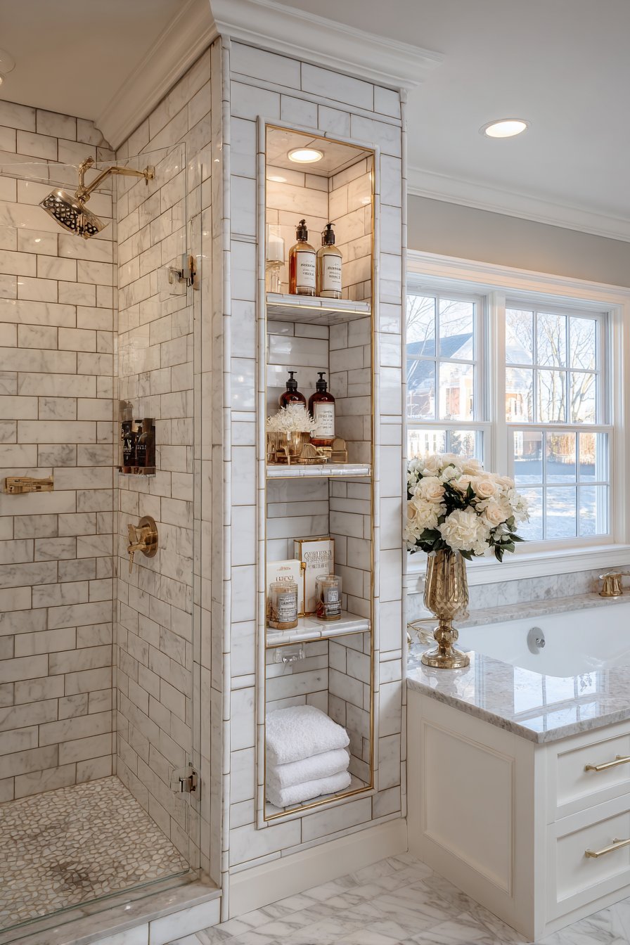 The timeless bathroom design incorporates a vertical niche built into white subway tile between the shower and bathtub area, providing accessible storage that serves both fixtures. Four evenly spaced marble shelves create organized display for luxury bath products, folded washcloths, and aromatic candles, transforming functional storage into an elegant design feature. The brushed gold tile trim framing the niche opening introduces warmth and luxury while creating clear definition between the recess and surrounding tile field.