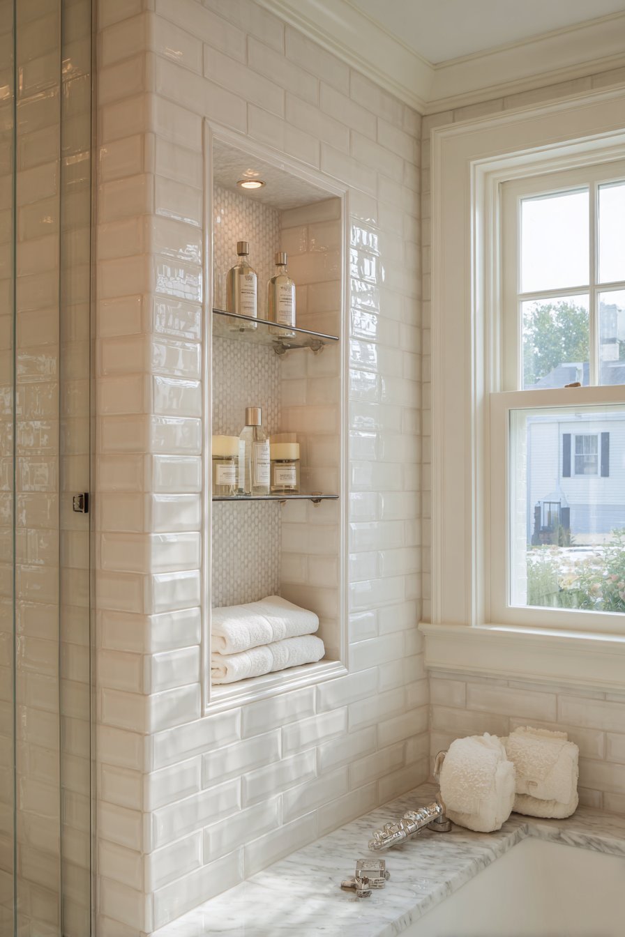 21. Transitional Bathroom with Classic Vertical Shower Niche