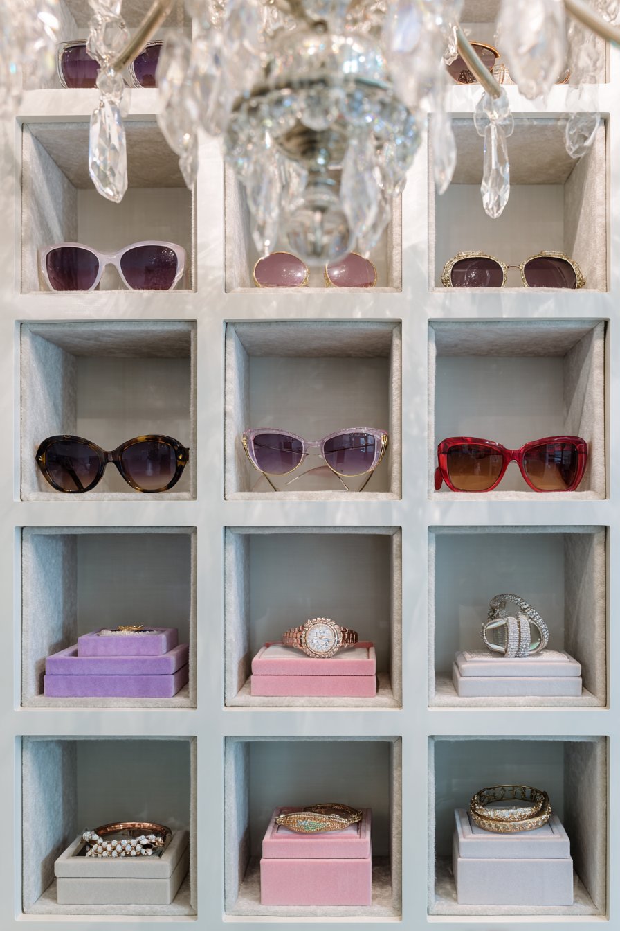 The master closet achieves boutique sophistication through multiple small square niches built into a fabric-wrapped accent wall. These velvet-lined recesses transform jewelry and accessory storage from hidden drawers into beautiful display, allowing daily selection to become a more enjoyable, visually engaging experience. Each niche holds watches, sunglasses, and small jewelry boxes, with carefully positioned items creating an organized yet personal presentation that resembles high-end retail displays.