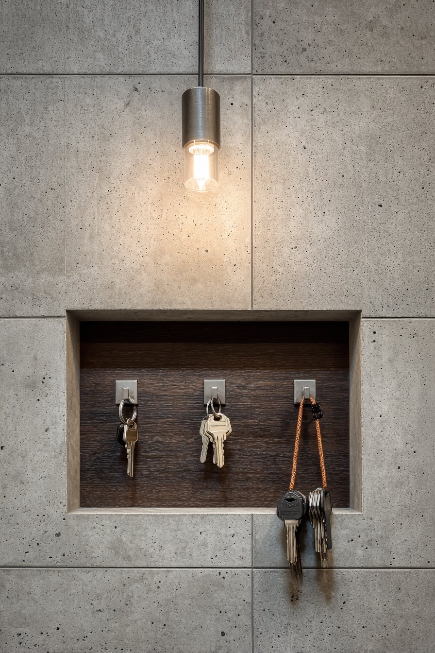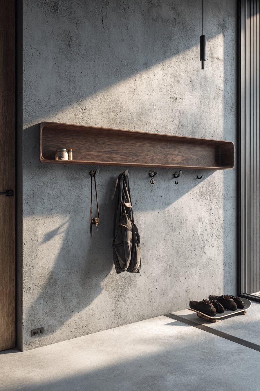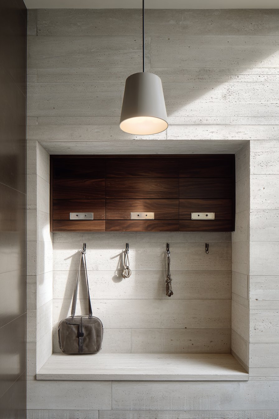 The streamlined entryway eliminates clutter through a single deep horizontal niche carved into smooth concrete-look wall at waist height. This multipurpose recess serves as the household’s command center, with a dark walnut interior shelf providing a dedicated landing spot for keys, wallets, and phones. Integrated mail slots keep incoming correspondence organized and contained, while small hooks mounted inside accommodate keys and dog leashes. Simple pendant lighting overhead creates downward illumination that ensures the niche remains functional even in dimly lit entryways.