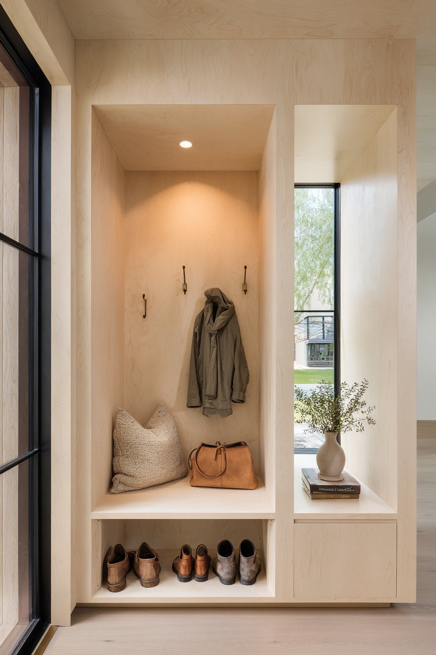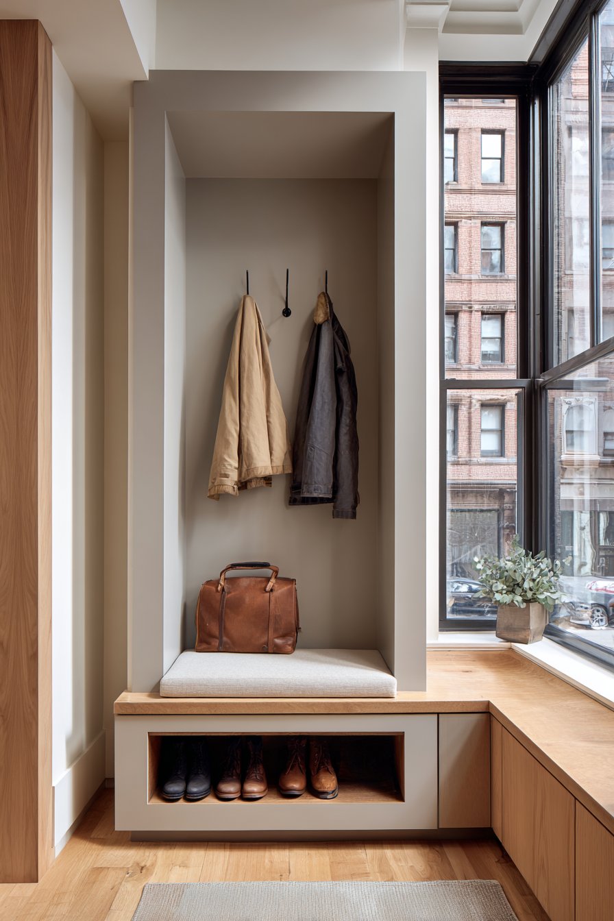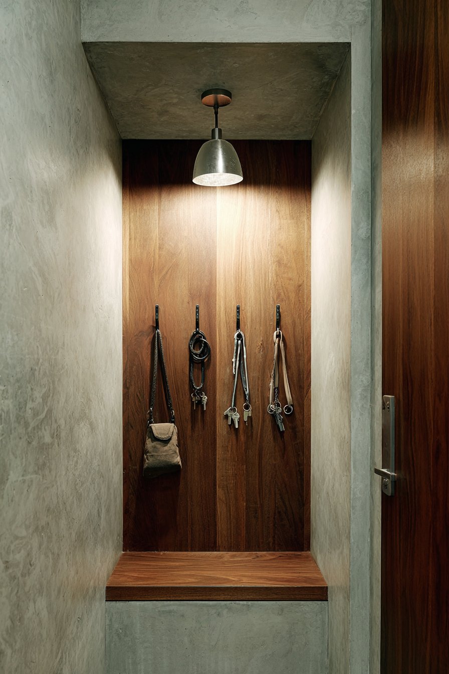 The streamlined entryway eliminates clutter through a single deep horizontal niche carved into smooth concrete-look wall at waist height. This multipurpose recess serves as the household’s command center, with a dark walnut interior shelf providing a dedicated landing spot for keys, wallets, and phones. Integrated mail slots keep incoming correspondence organized and contained, while small hooks mounted inside accommodate keys and dog leashes. Simple pendant lighting overhead creates downward illumination that ensures the niche remains functional even in dimly lit entryways.