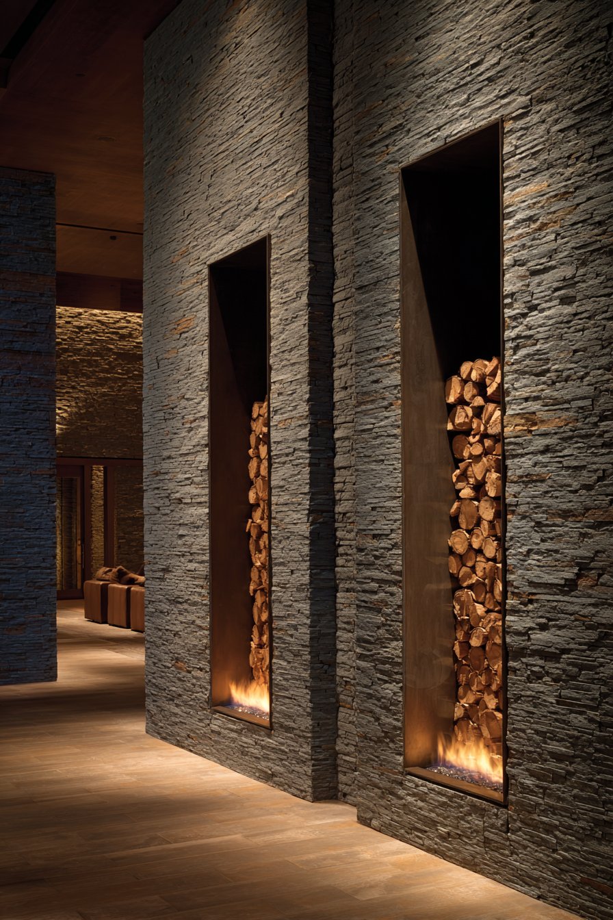 Evening firelight creates warm ambient glow that dances across the stone surfaces and illuminates the stacked wood within the niches, transforming functional storage into decorative element. The carefully arranged logs—bark sides facing outward, cut ends creating geometric patterns—become sculptural features that celebrate natural materials and traditional heating methods even though the gas fireplace provides the actual warmth. This juxtaposition of modern convenience and traditional aesthetic demonstrates how contemporary design can honor historical precedents while embracing current technology.