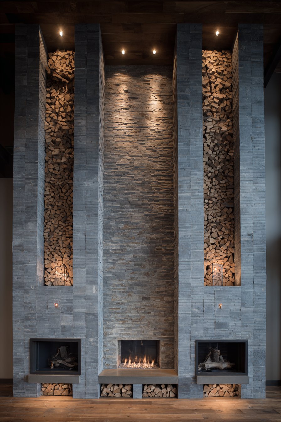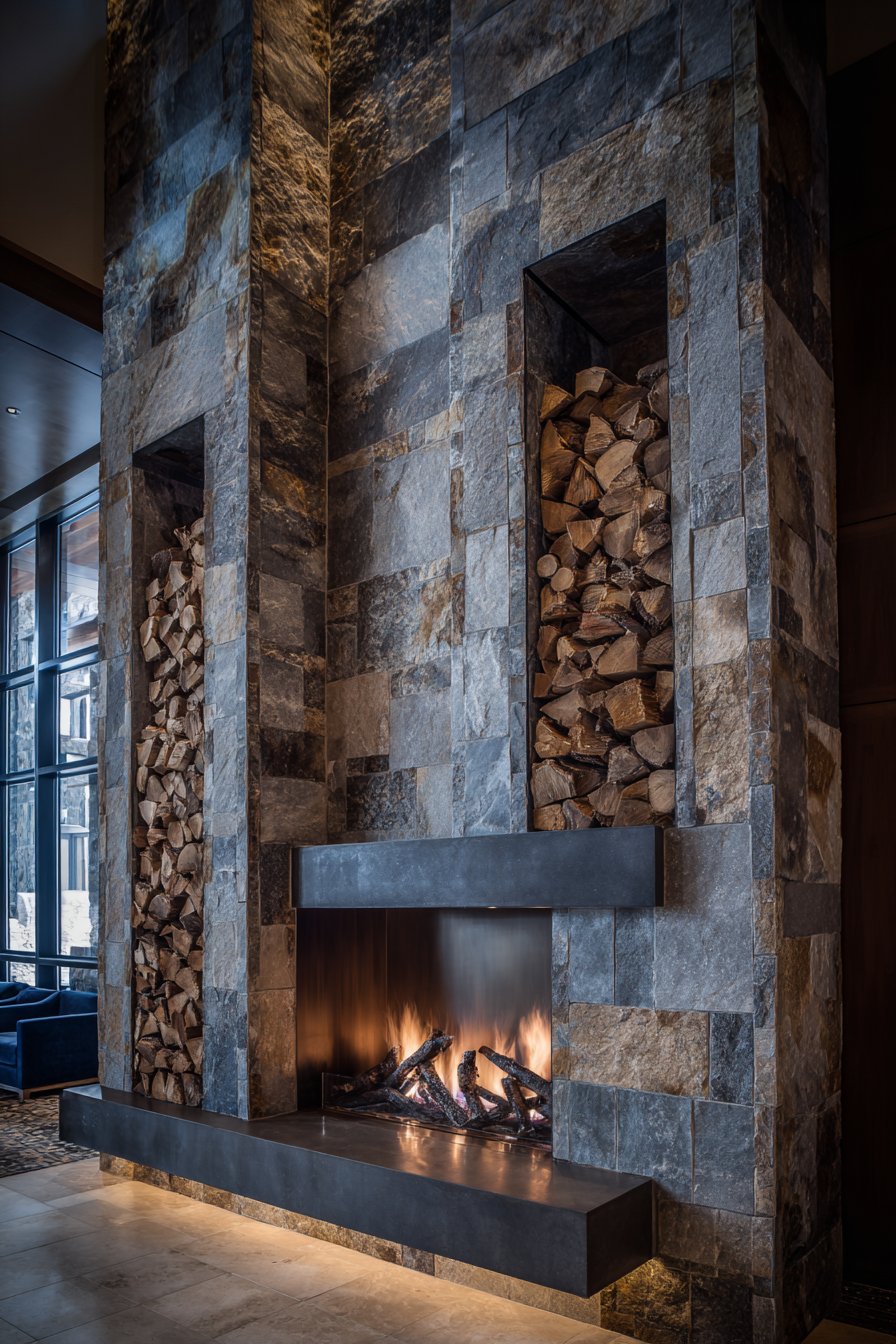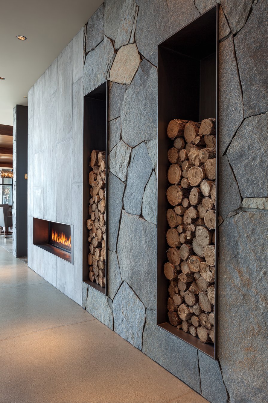 The dramatic living room fireplace becomes a three-part composition through large vertical niches flanking a modern linear gas fireplace. These substantial recesses built into a floor-to-ceiling stacked stone accent wall provide practical storage for neatly stacked firewood logs while creating textural and visual interest that enhances the fireplace’s impact. The deep niches accommodate substantial wood quantities, ensuring the supply remains readily accessible during cold months without requiring outdoor trips during cozy evenings.