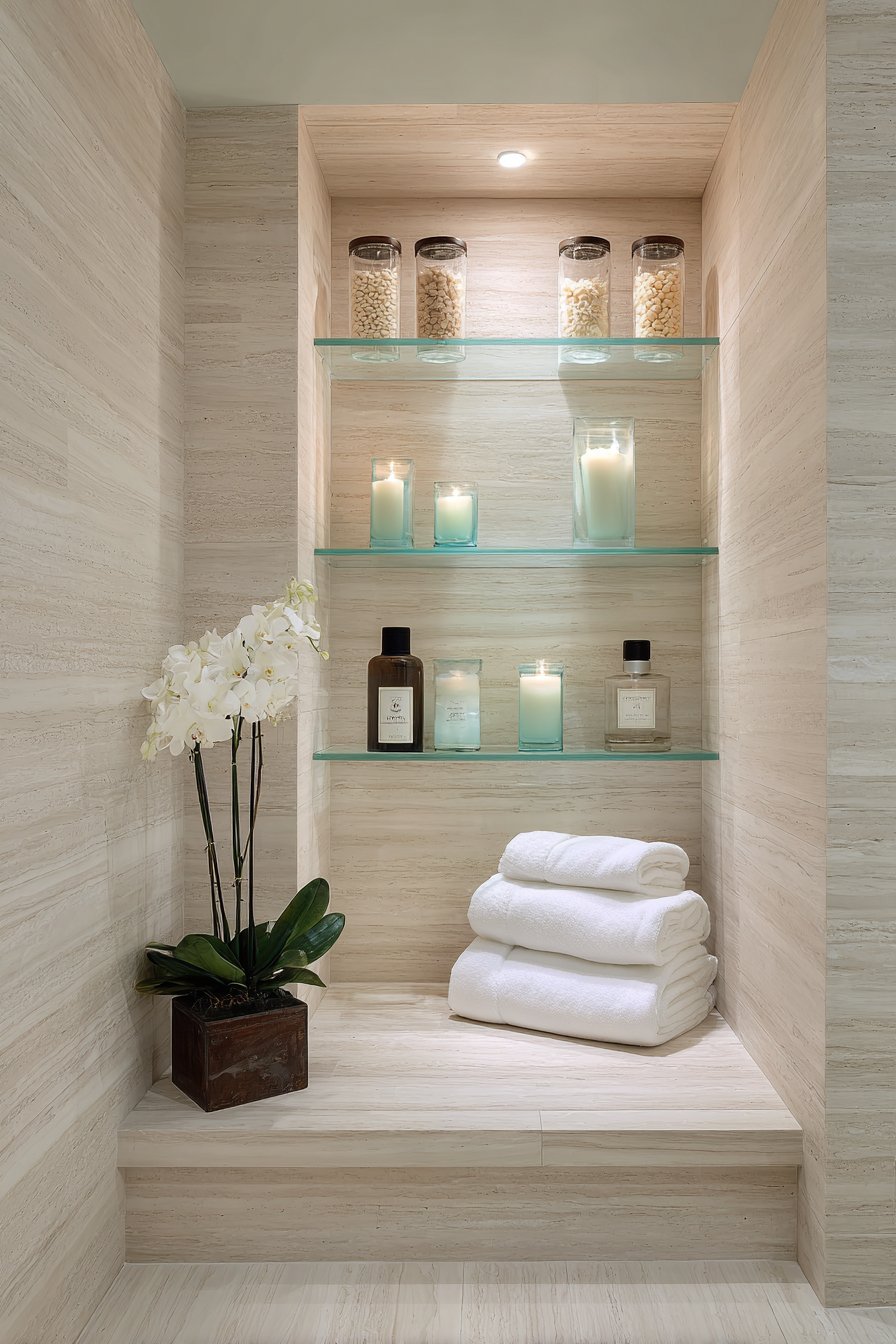 - Limit displayed items to maintain clean, uncluttered spa aesthetic