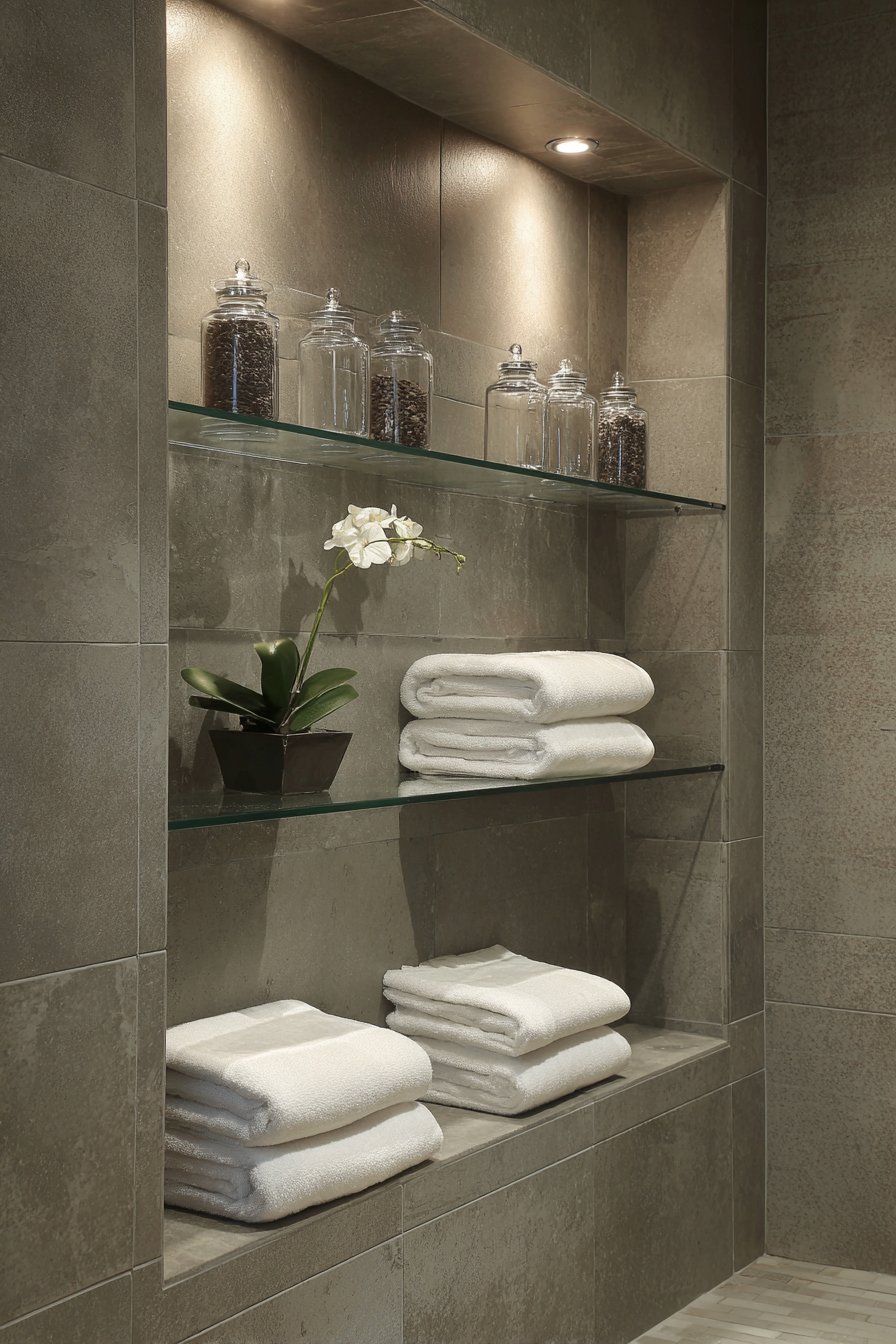 The carefully curated contents—white towels, glass apothecary jars with bath salts, a small orchid plant—create a spa-like atmosphere that elevates daily showering into a wellness ritual. The monochromatic color palette of grays and whites promotes calm and relaxation, while the varied textures—smooth glass, soft terry cloth, organic flower petals—provide subtle visual interest without overwhelming the serene aesthetic. Vertical LED strip lighting along both sides creates even illumination that prevents shadows and highlights the beautiful materials.