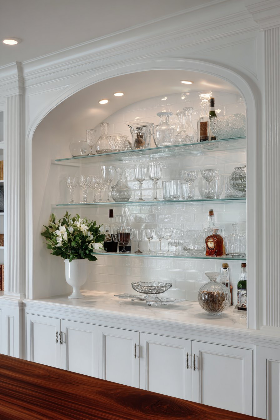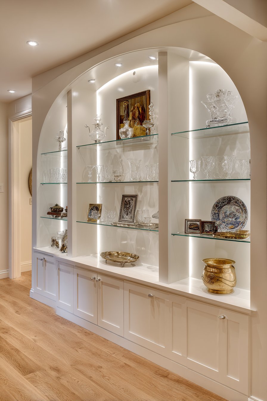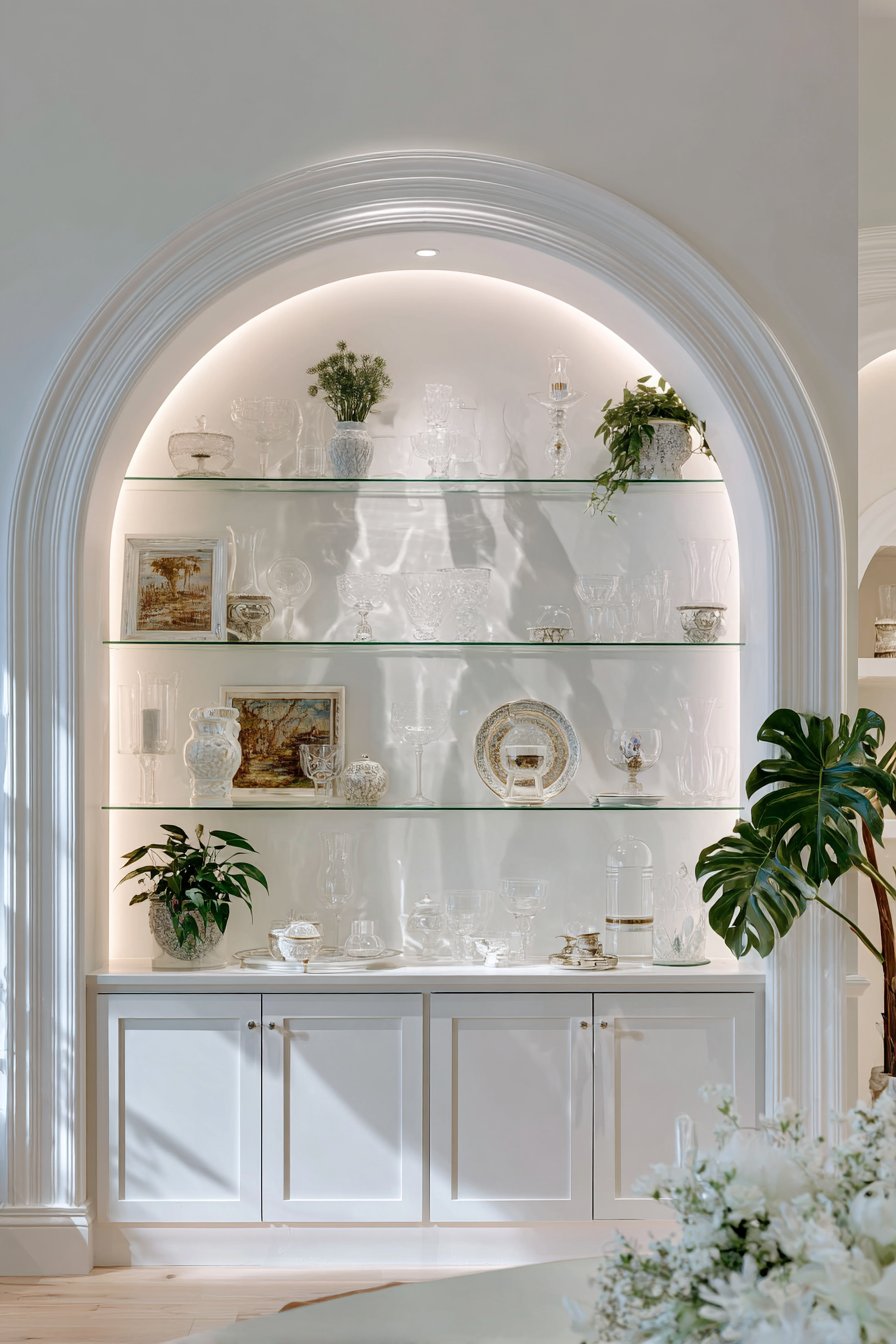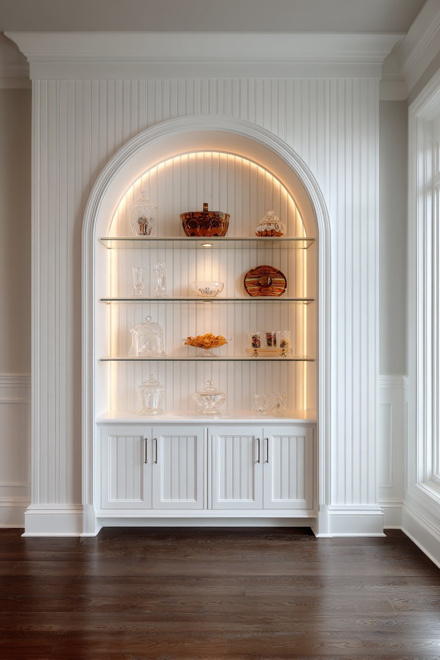 The elegant dining room celebrates classical architecture through a large arched niche carved into white painted millwork. This prominent recess features three adjustable glass shelves displaying a treasured collection of vintage glassware and serving pieces, transforming functional storage into beautiful display. The integrated LED strip lighting along the arch perimeter creates a warm glow that highlights the translucent qualities of glass while casting subtle shadows that emphasize the dimensional depth of the recess.