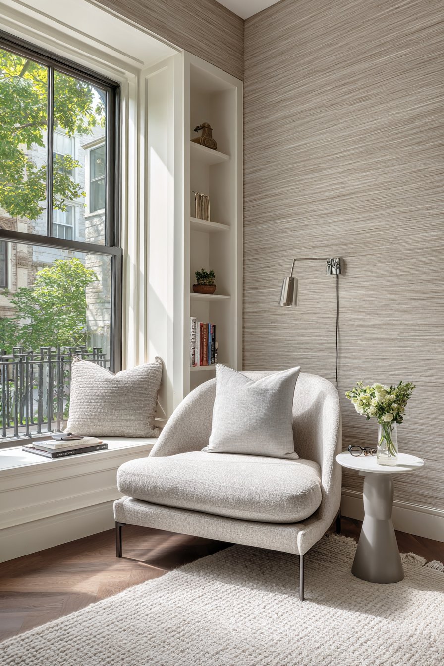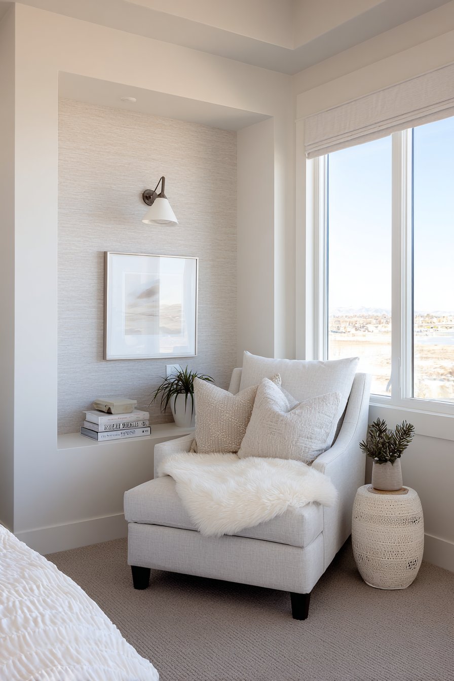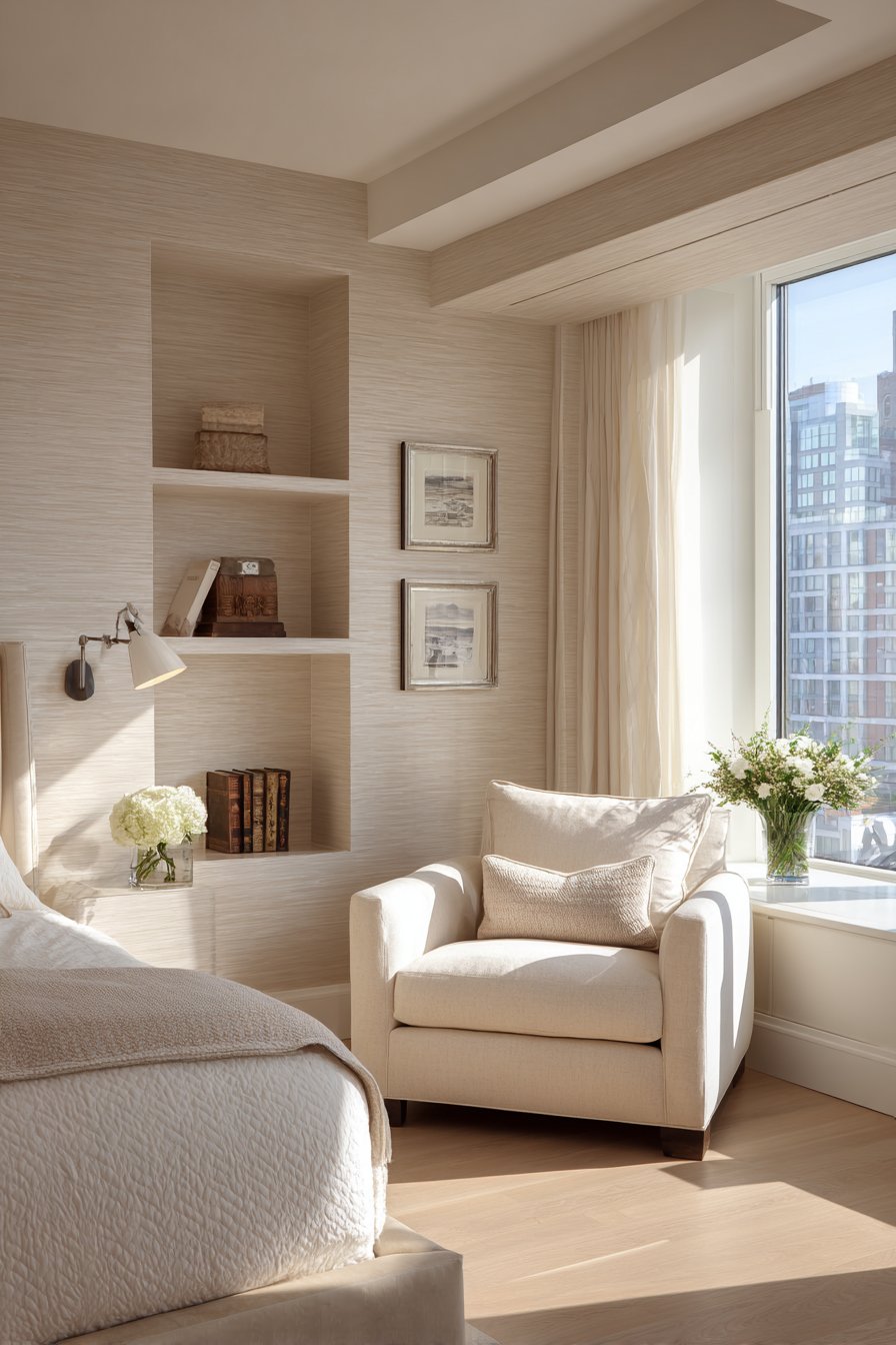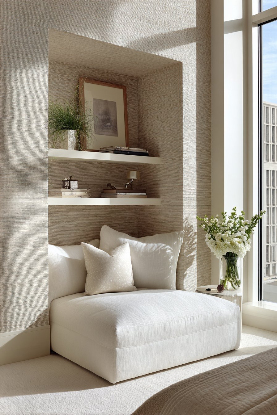 The thoughtfully designed bedroom sitting area incorporates small horizontal niches flanking an upholstered reading chair. These practical recesses built into textured linen wallpaper each contain a simple swing-arm reading lamp and a small shelf for books and reading glasses, creating a dedicated reading environment without the visual clutter of floor or table lamps. The painted white interiors create clean backdrops for the functional elements while the surrounding wallpaper texture adds subtle pattern and visual interest.