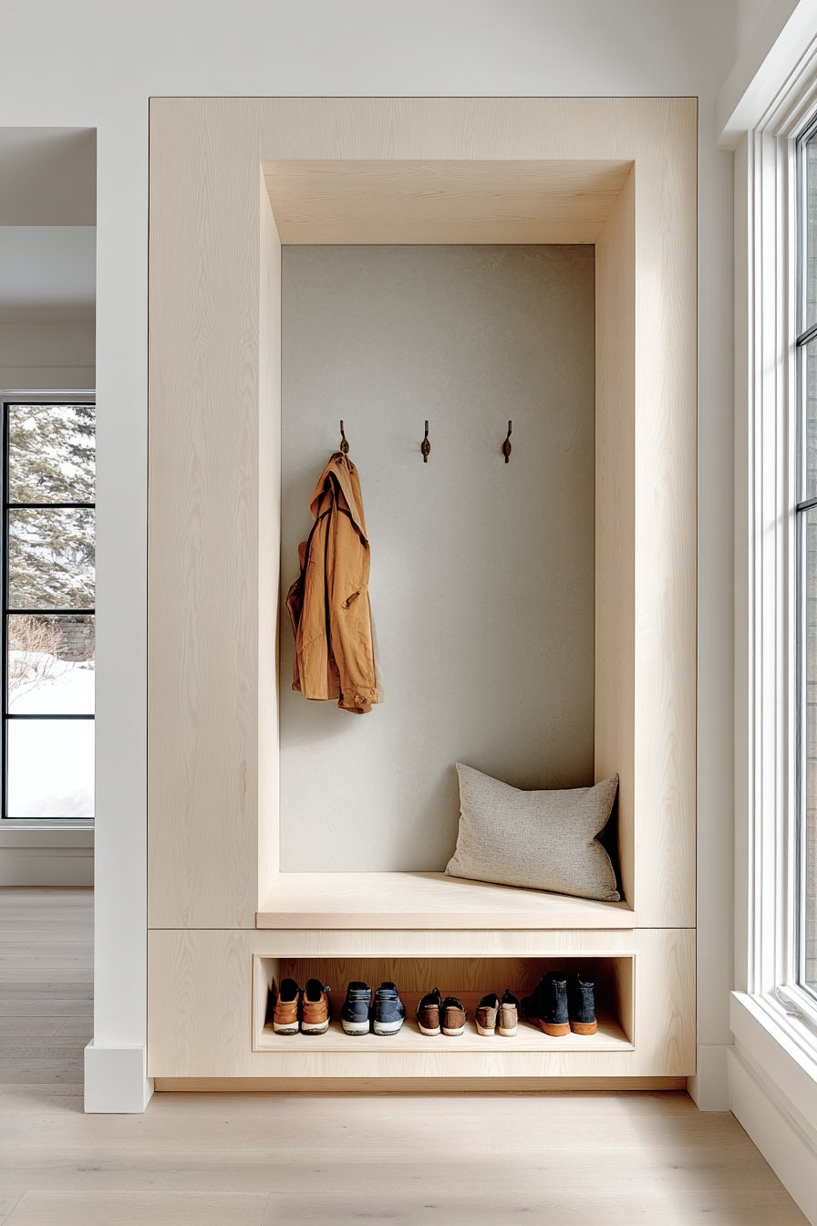 The warm gray interior paint creates a soft contrast against the natural birch surround, adding depth while maintaining the light, airy quality essential to Scandinavian interiors. This color choice prevents the niche from appearing as a dark void while providing enough tonal variation to define the recessed space. Soft diffused daylight from a nearby window bathes the entryway in natural illumination, highlighting the beautiful grain patterns in the birch wood and creating gentle shadows that emphasize the niche’s dimensional quality.