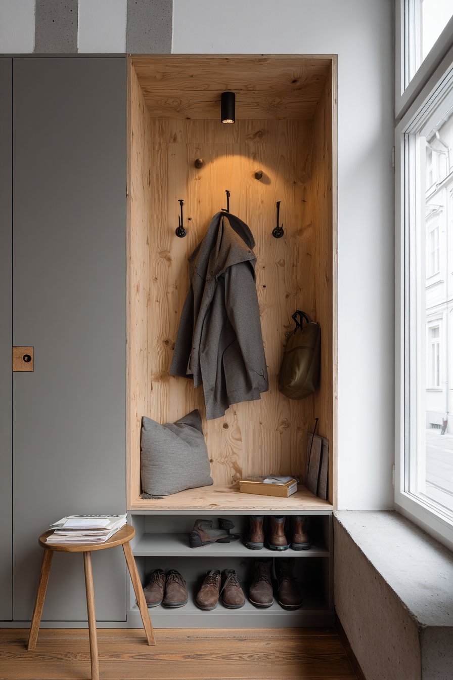 The Scandinavian-inspired entryway embraces both beauty and functionality through a tall vertical niche built directly into a light wood panel wall. This floor-to-ceiling recess serves as a dedicated coat storage solution that eliminates the need for freestanding furniture while maintaining the clean, uncluttered aesthetic characteristic of Nordic design. The integration of hooks for hanging coats and a lower shelf recess for shoes demonstrates how a single architectural feature can address multiple functional needs without sacrificing visual appeal.