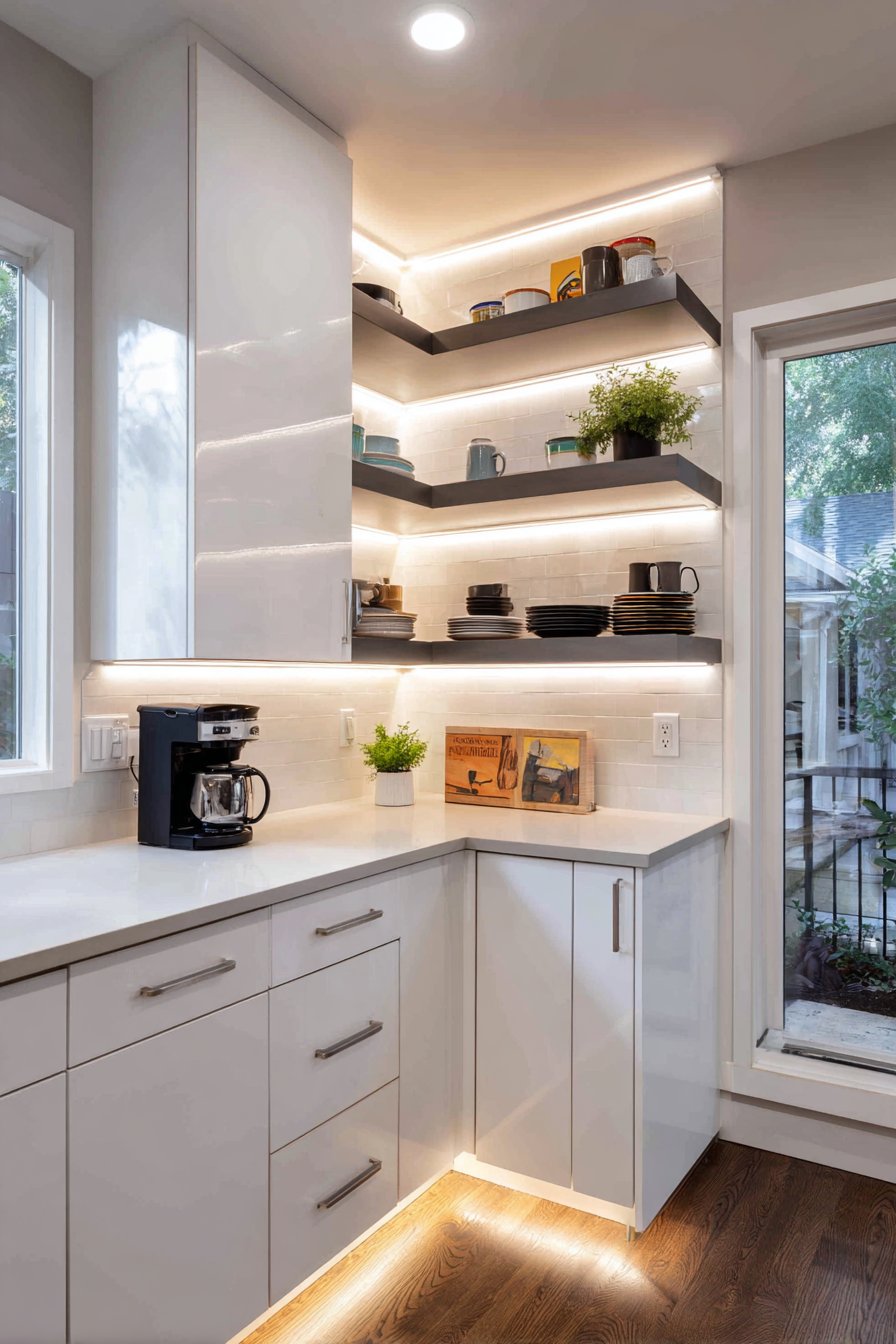 The contrasting dark gray interiors of each niche provide visual depth and prevent the white dishes and cups from visually blending into the background. This color strategy creates definition and makes displayed items appear more intentional and curated rather than simply stored. Integrated under-shelf lighting illuminates the contents while casting a warm glow across the backsplash, enhancing the kitchen’s ambient lighting and making the space feel welcoming during evening hours.