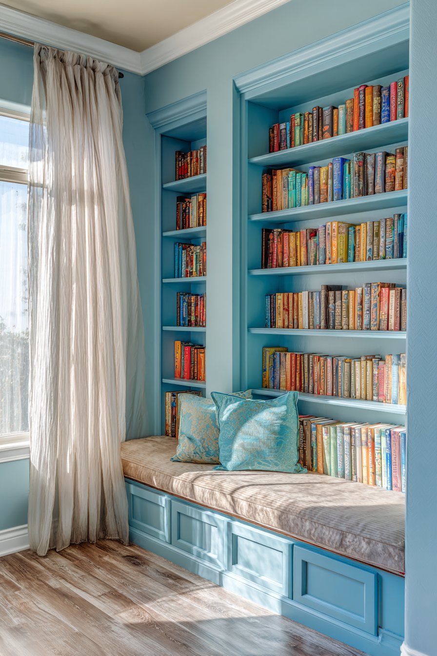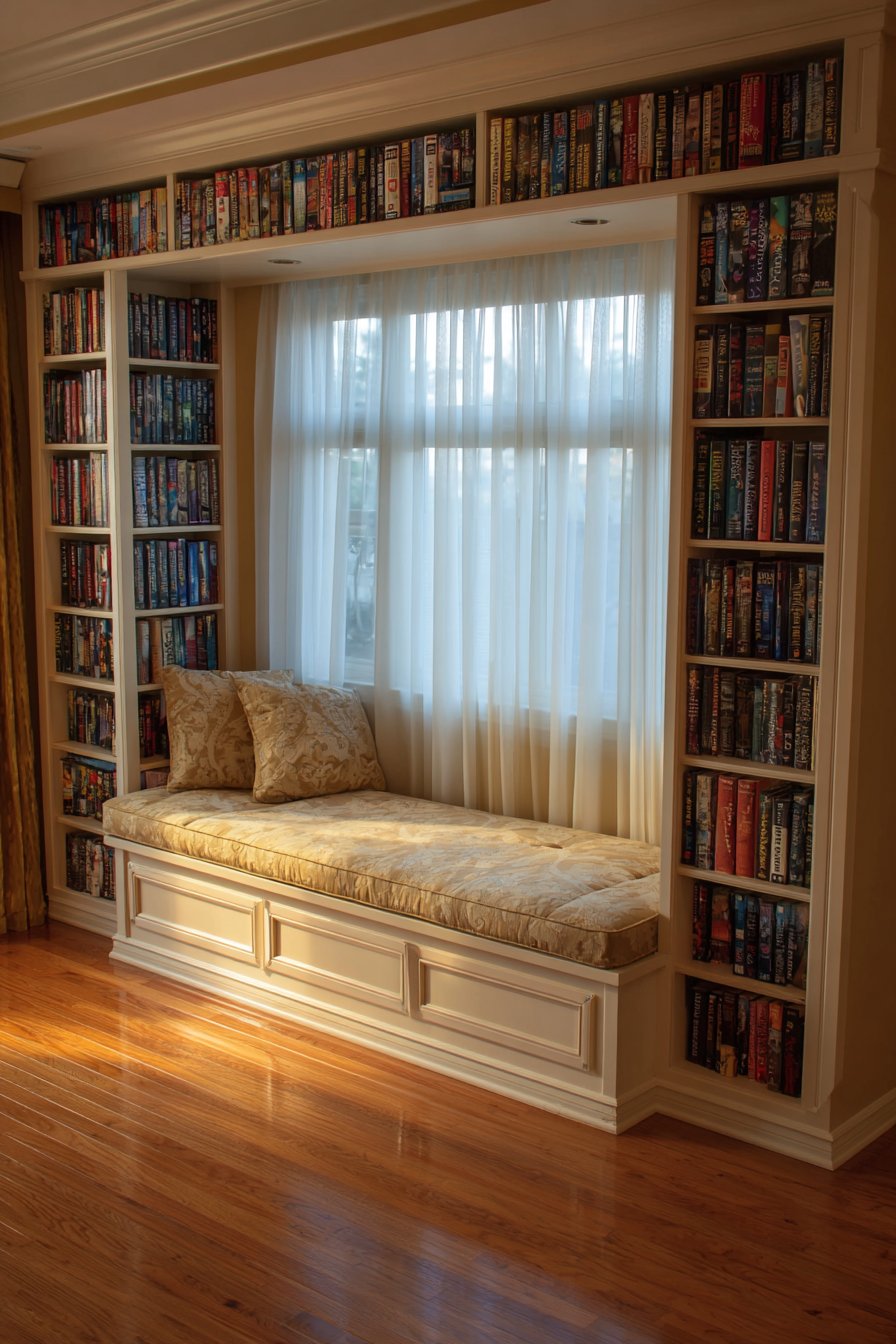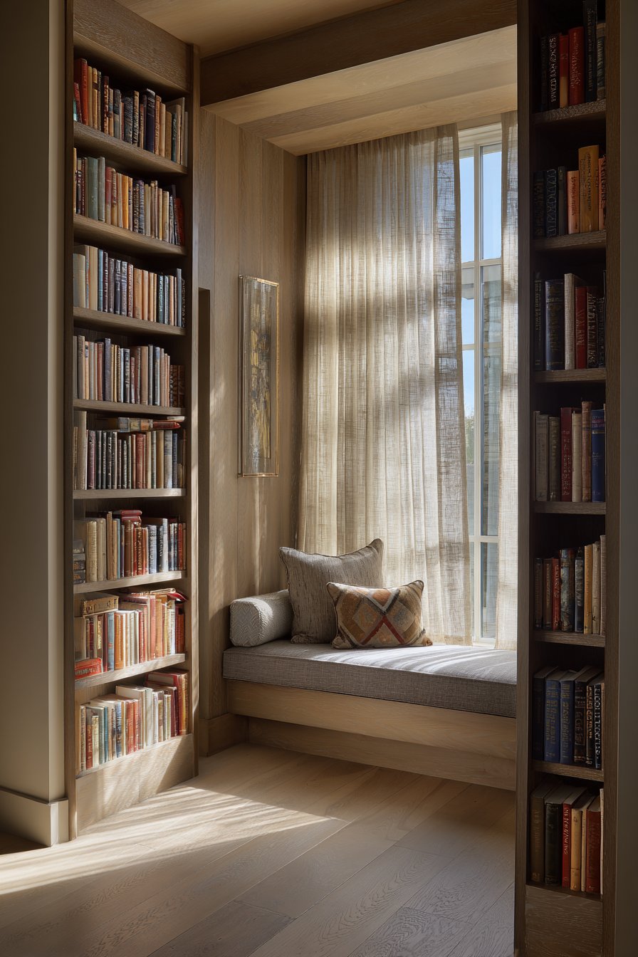 Natural wood trim framing each recess introduces warmth and definition, complementing the oak flooring and creating visual continuity throughout the space. The wood’s natural grain patterns add organic texture that contrasts beautifully with the smooth painted walls and uniform rows of books. Soft afternoon sunlight filtering through sheer curtains bathes the entire nook in diffused natural light, highlighting the varied textures of book covers, wood grain, and fabric cushions while creating an inviting glow that beckons readers to settle in with a good book.