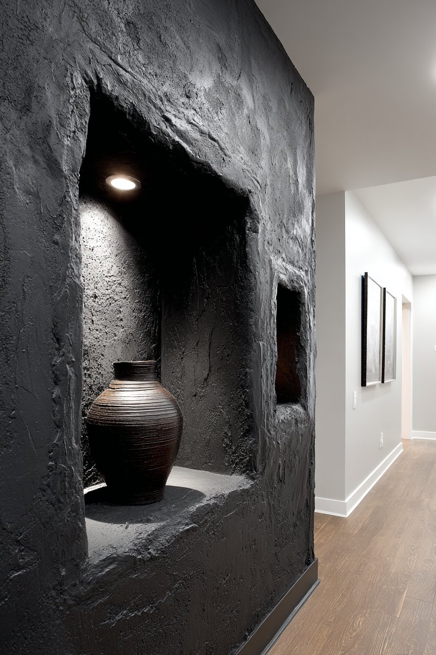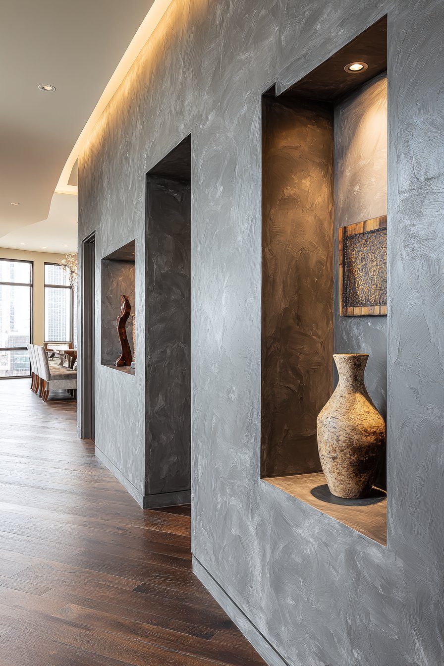 The dining room wall commands attention through a large rectangular niche carved into a textured concrete-look wall, creating a dramatic focal point that anchors the entire space. Painted in deep charcoal gray, the niche interior creates striking contrast against the lighter surrounding wall while providing a sophisticated backdrop for displayed art and collectibles. Concealed LED lighting washing down the back wall transforms the niche into a illuminated shadow box that highlights textures and forms while adding ambient lighting to the dining area.