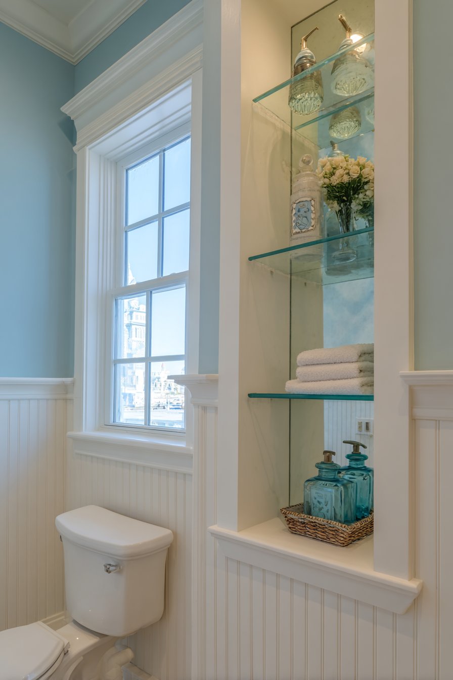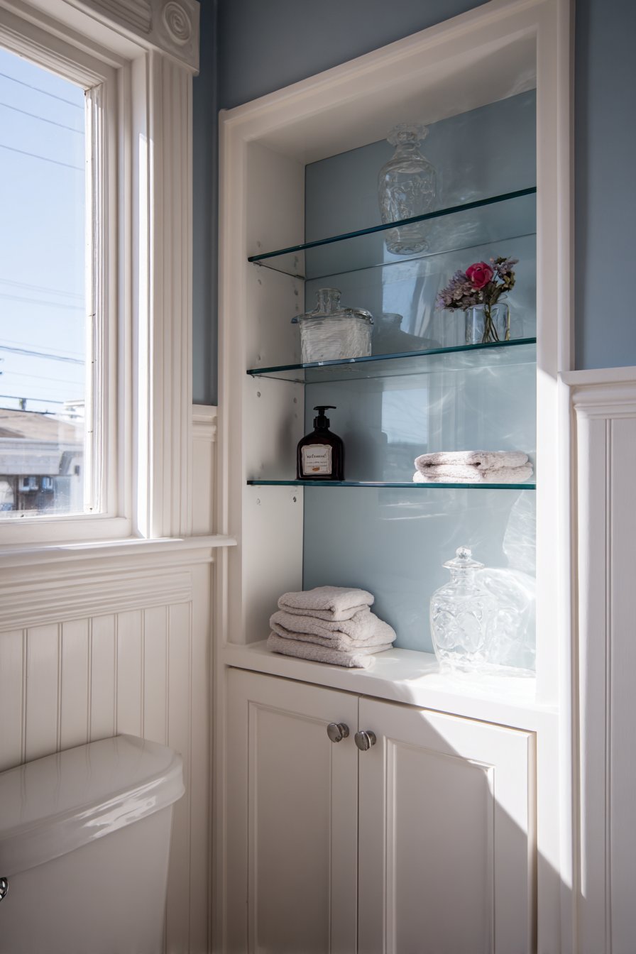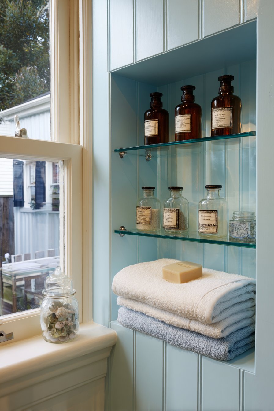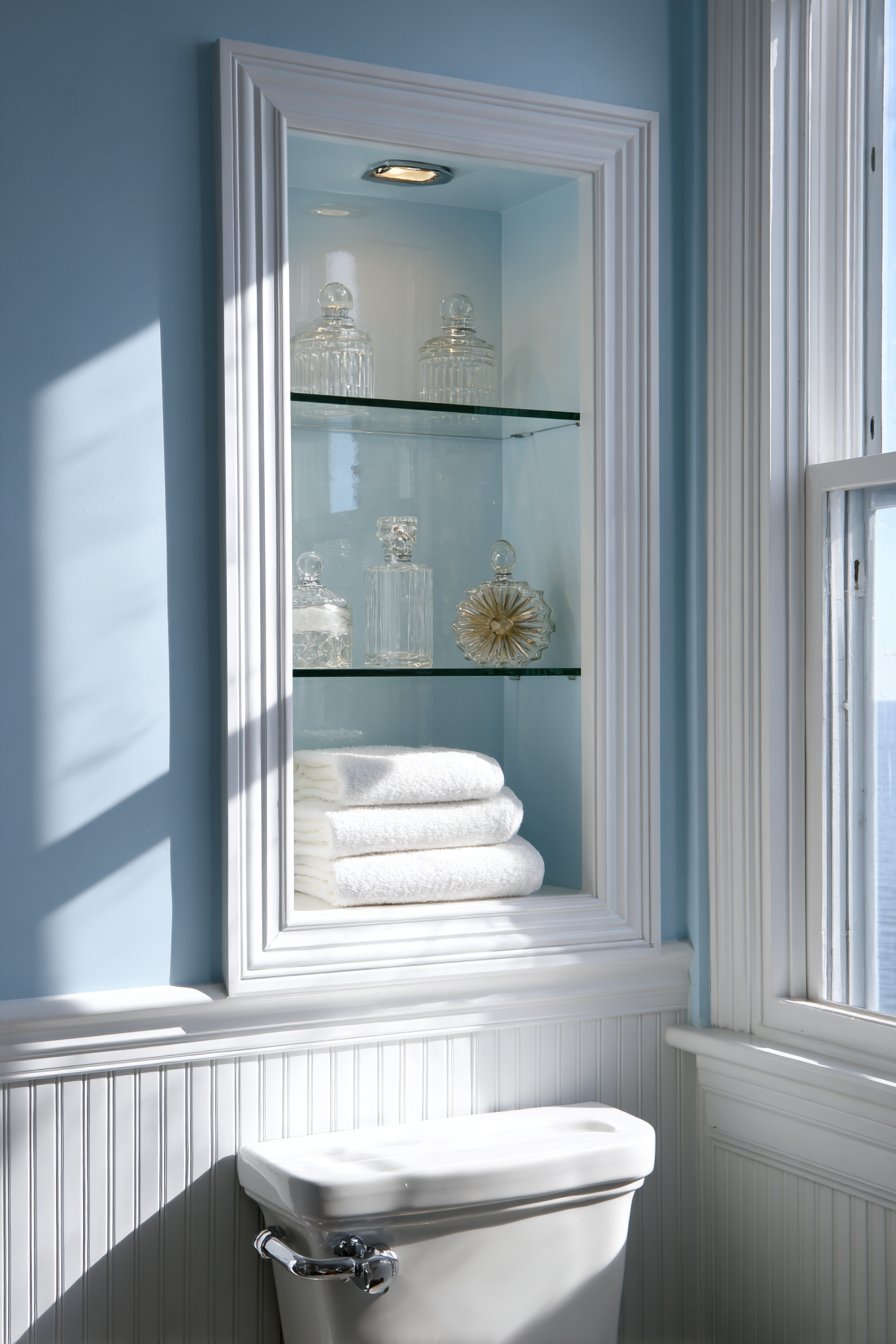 Carved into classic white beadboard wainscoting, the niche feels integrated into the room’s coastal-inspired architecture rather than appearing as an afterthought. The soft blue interior paint introduces a subtle pop of color that reinforces the seaside aesthetic while preventing the niche from disappearing into the white surroundings. Natural light from a small window creates gentle highlights on the glass shelves, making them appear to float within the recess while the translucent materials maintain visual lightness essential in space-constrained environments.