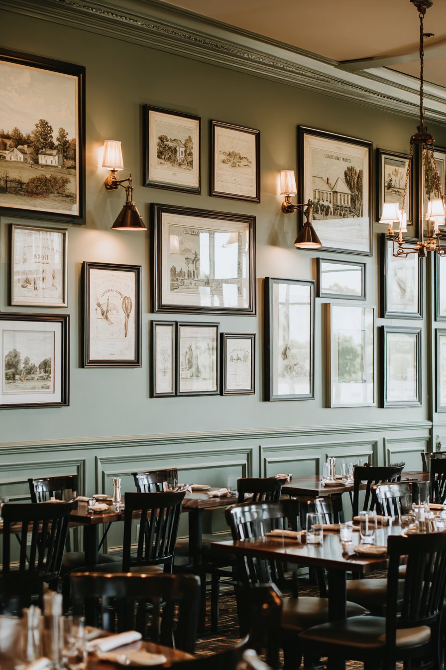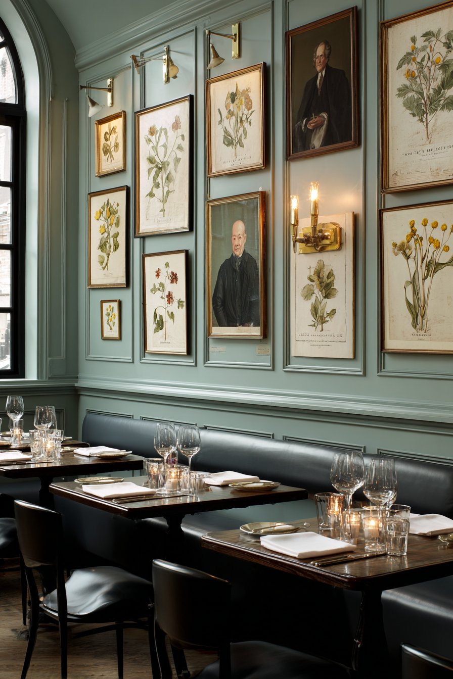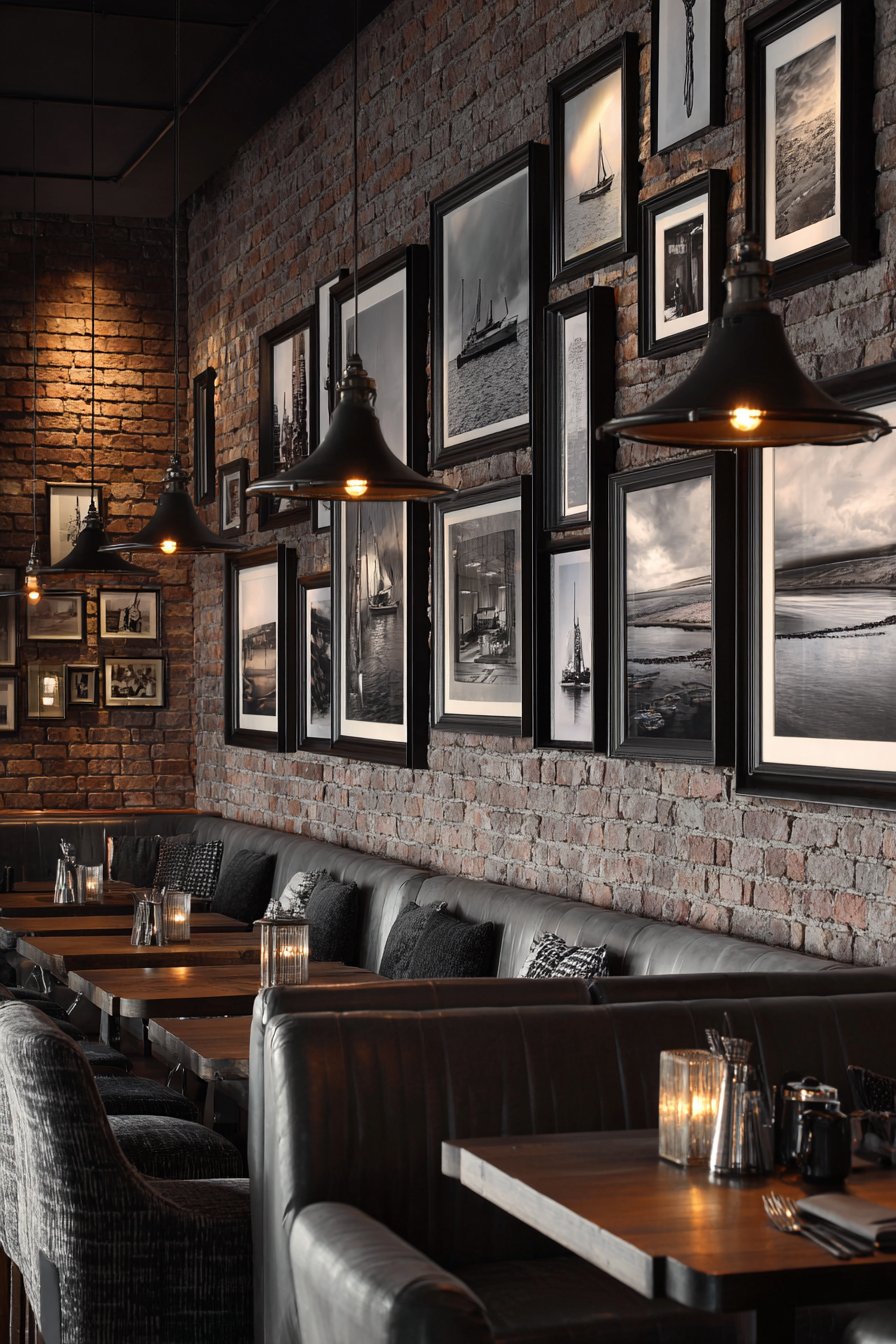 - Position the gallery wall at eye level when seated, as this is where diners will view it most frequently