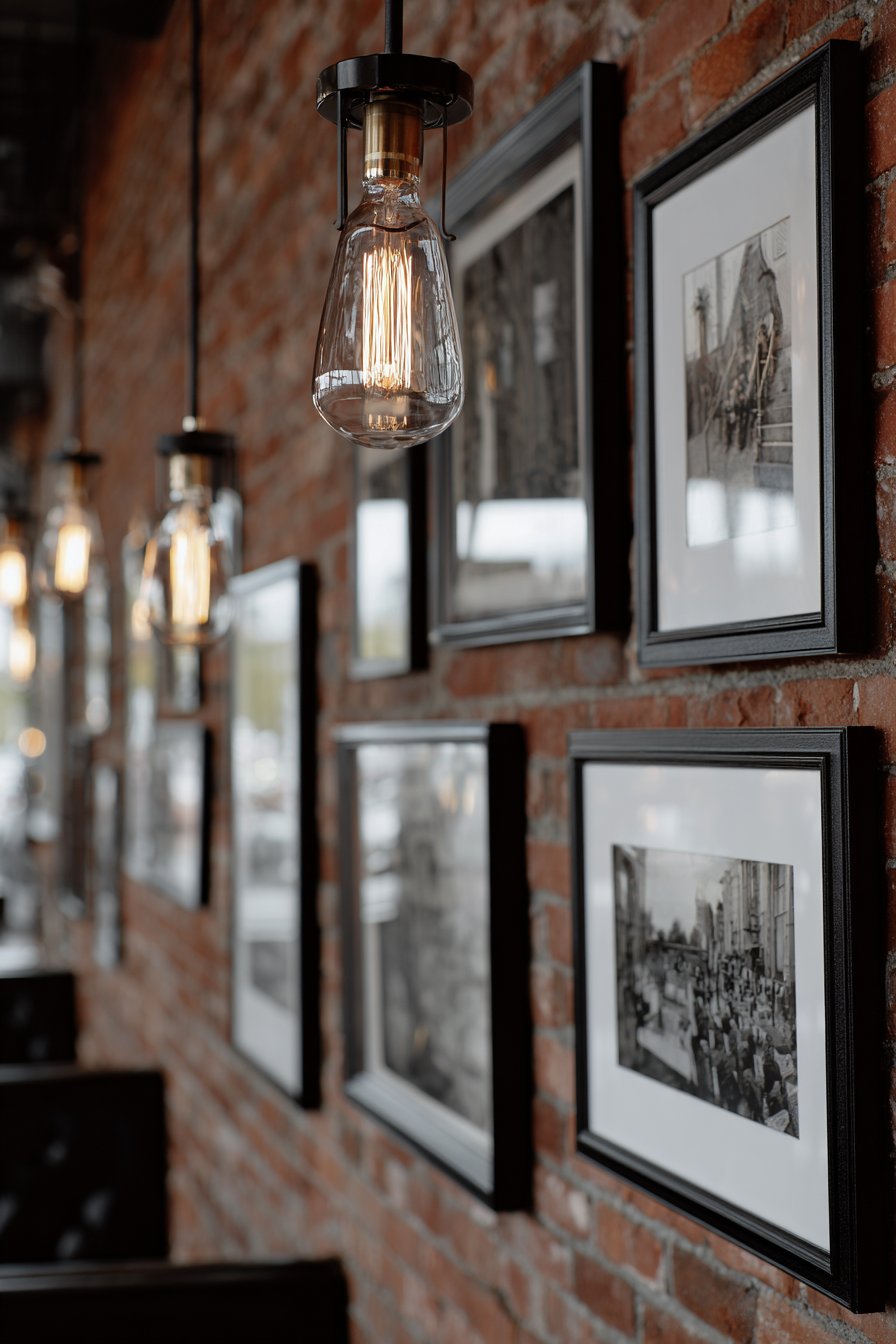 A sophisticated gallery wall arrangement featuring black and white vintage photography brings artistic credibility and cultural depth to restaurant spaces, particularly those with an emphasis on craft, tradition, or local heritage. The careful curation of photographic prints in varied frame sizes creates visual rhythm and movement along the wall, with alternating finishes between matte black wood and brushed brass adding subtle luxury without overwhelming the imagery. When installed against exposed brick, the contrast between the refined framed photographs and the raw, textured brick surface creates compelling visual tension that engages viewers and encourages closer examination.