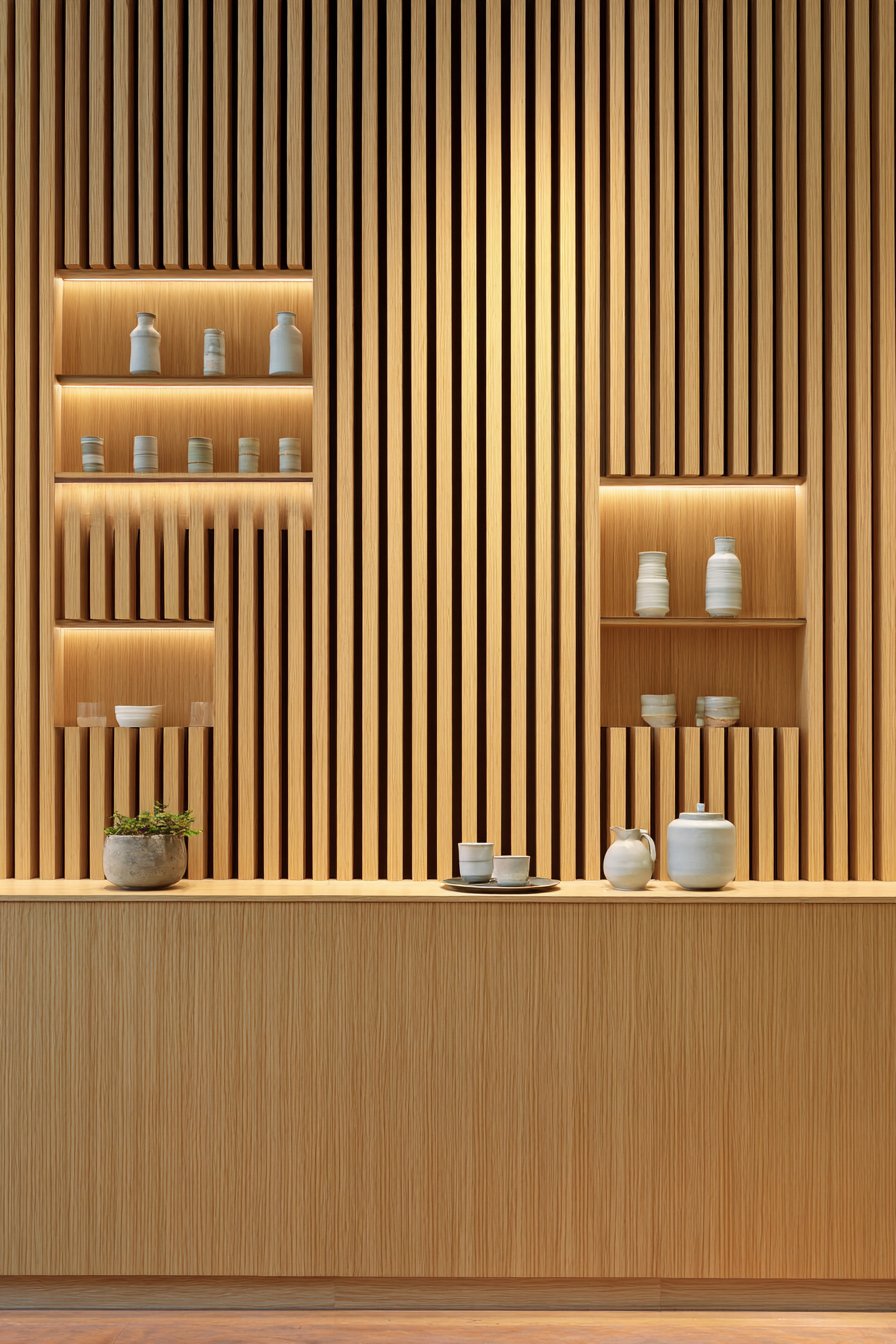 Warm downlighting emphasizes the slat wall’s linear pattern and natural wood grain, creating vertical emphasis that makes ceilings appear higher—a valuable effect in restaurants with standard ceiling heights. The Scandinavian-inspired design aesthetic communicates values of simplicity, quality craftsmanship, and natural materials that resonate with contemporary consumers seeking authentic, sustainable dining experiences. The light oak finish provides warmth without heaviness, working particularly well in spaces with abundant natural light or northern exposures where warmer wood tones help compensate for cool daylight quality.
