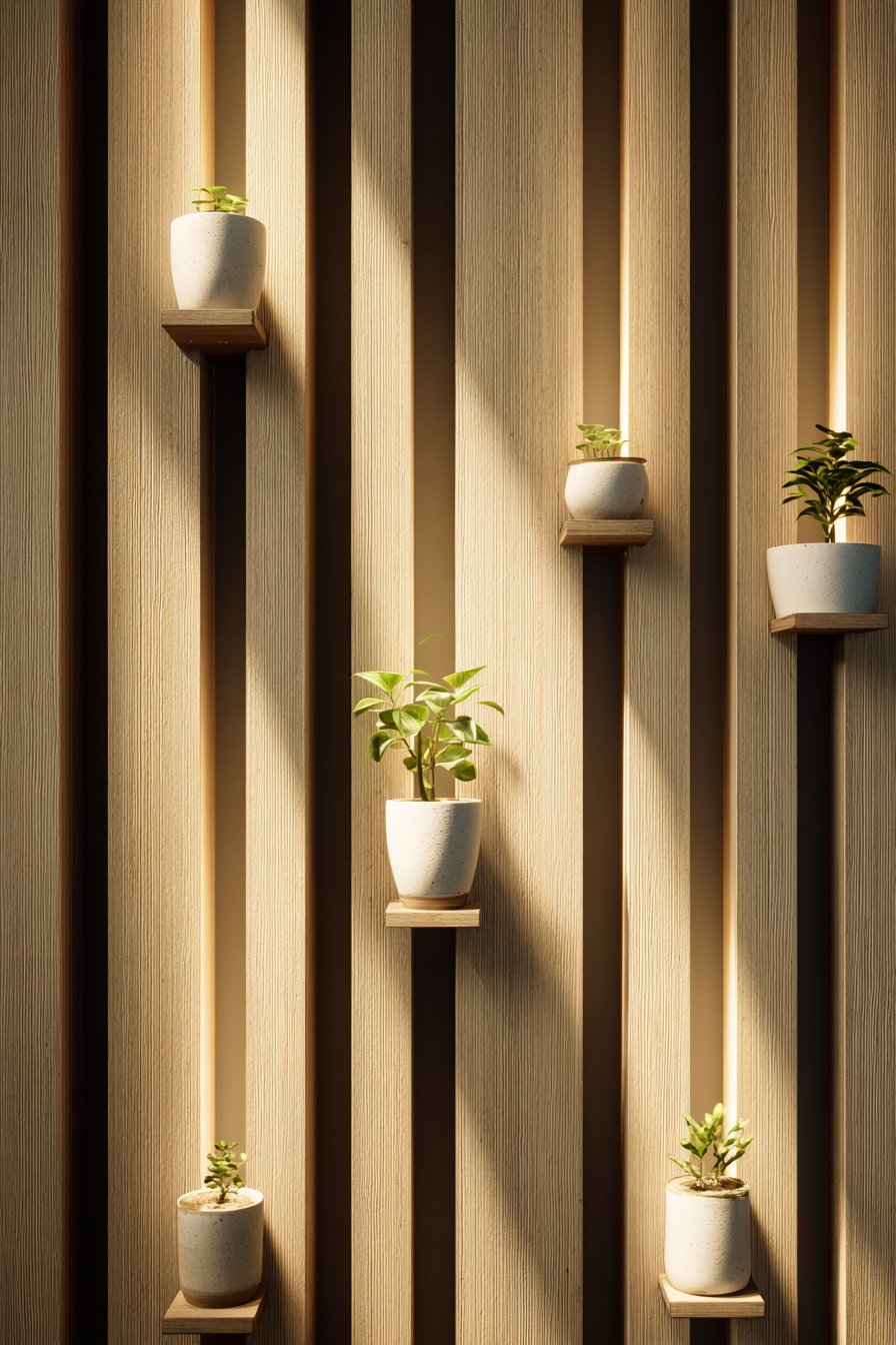 A modern slat wall installation using vertical wooden battens in light oak finish creates sophisticated rhythmic patterns through the interplay of solid wood and negative space. The even spacing between battens generates shadow lines that shift throughout the day as light angles change, providing subtle visual animation without requiring electronic displays or mechanical movement. Integrated shelving slots between select battens offer functional display opportunities for minimalist ceramics and small plants without disrupting the overall linear composition.