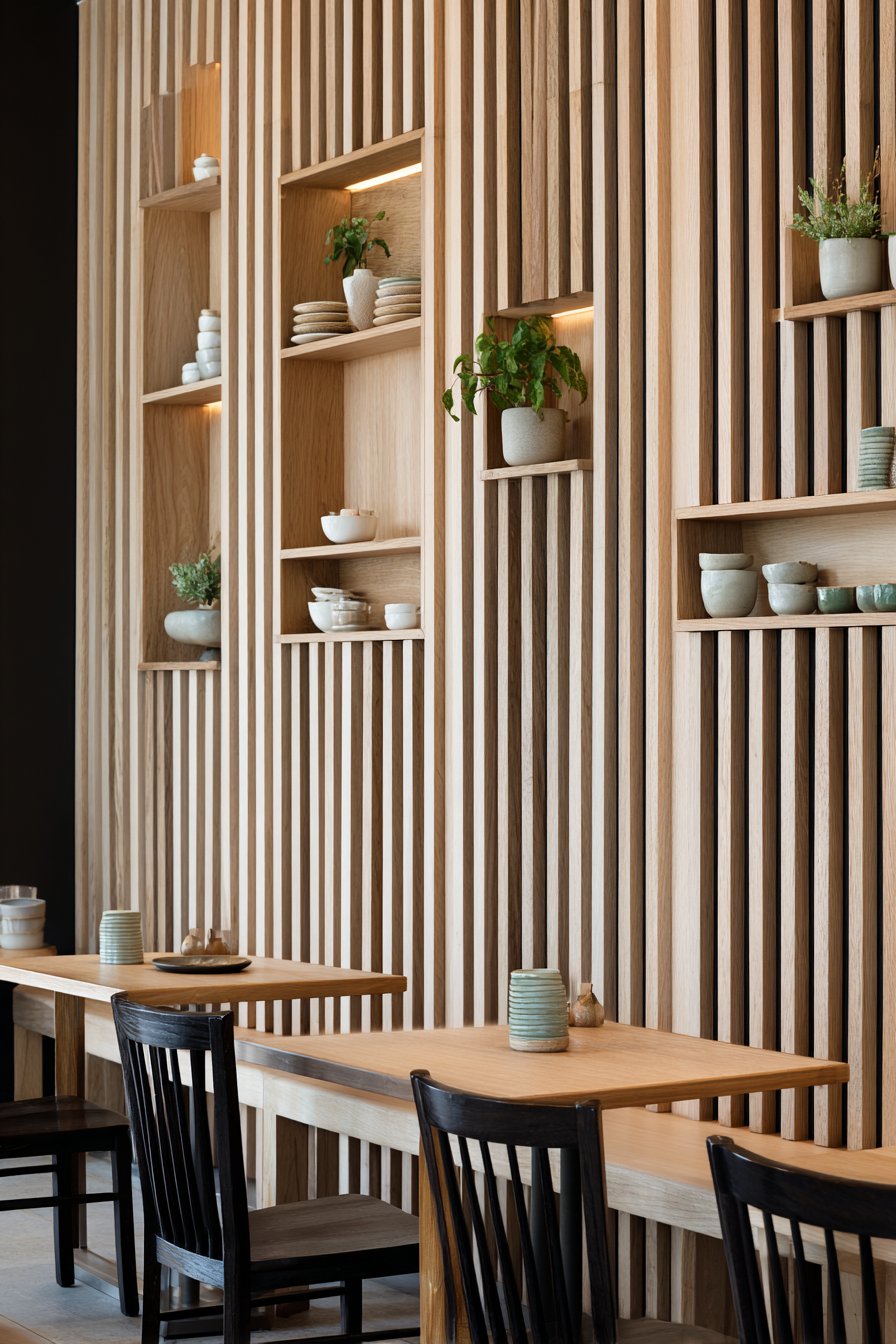 Wide-angle professional photography captures the slat wall providing textural warmth while maintaining clean lines, showing balanced exposure of both shadow details within the battens and illuminated wood surfaces. This restaurant wall design idea excels in contemporary Nordic-inspired restaurants, health-focused cafés, or any establishment where minimalist aesthetics align with brand positioning. The installation also offers acoustic benefits, as the gaps between battens and any backing material can be filled with sound-absorbing material to reduce noise levels in busy dining environments.