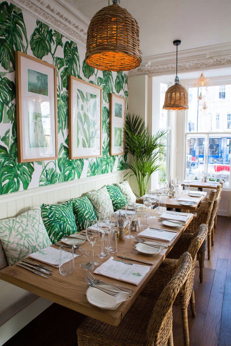 Crown molding in crisp white frames the wallpaper’s top edge, providing visual termination and architectural refinement that prevents the bold pattern from feeling unfinished or overwhelming. The contrast between elaborate patterned walls and simpler ceiling treatments creates balanced visual hierarchy, ensuring the space reads as sophisticated rather than chaotic. Interior photography captures the restaurant’s fresh, vibrant aesthetic with natural daylight highlighting the wallpaper’s color richness and intricate pattern details.