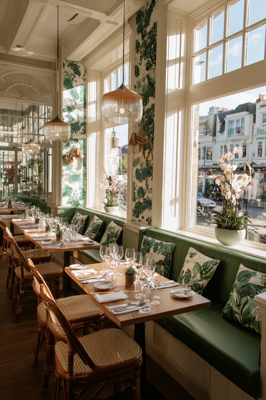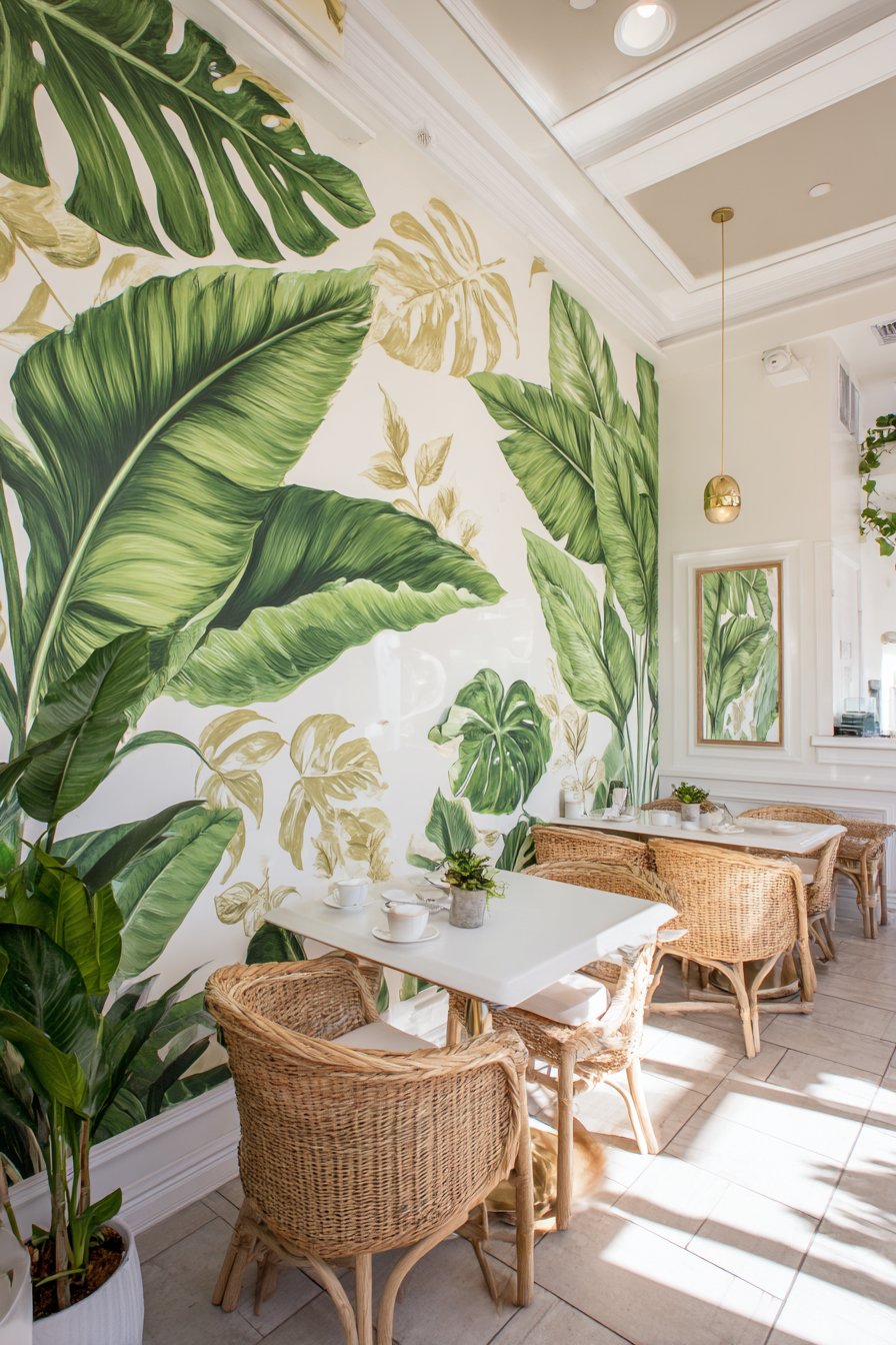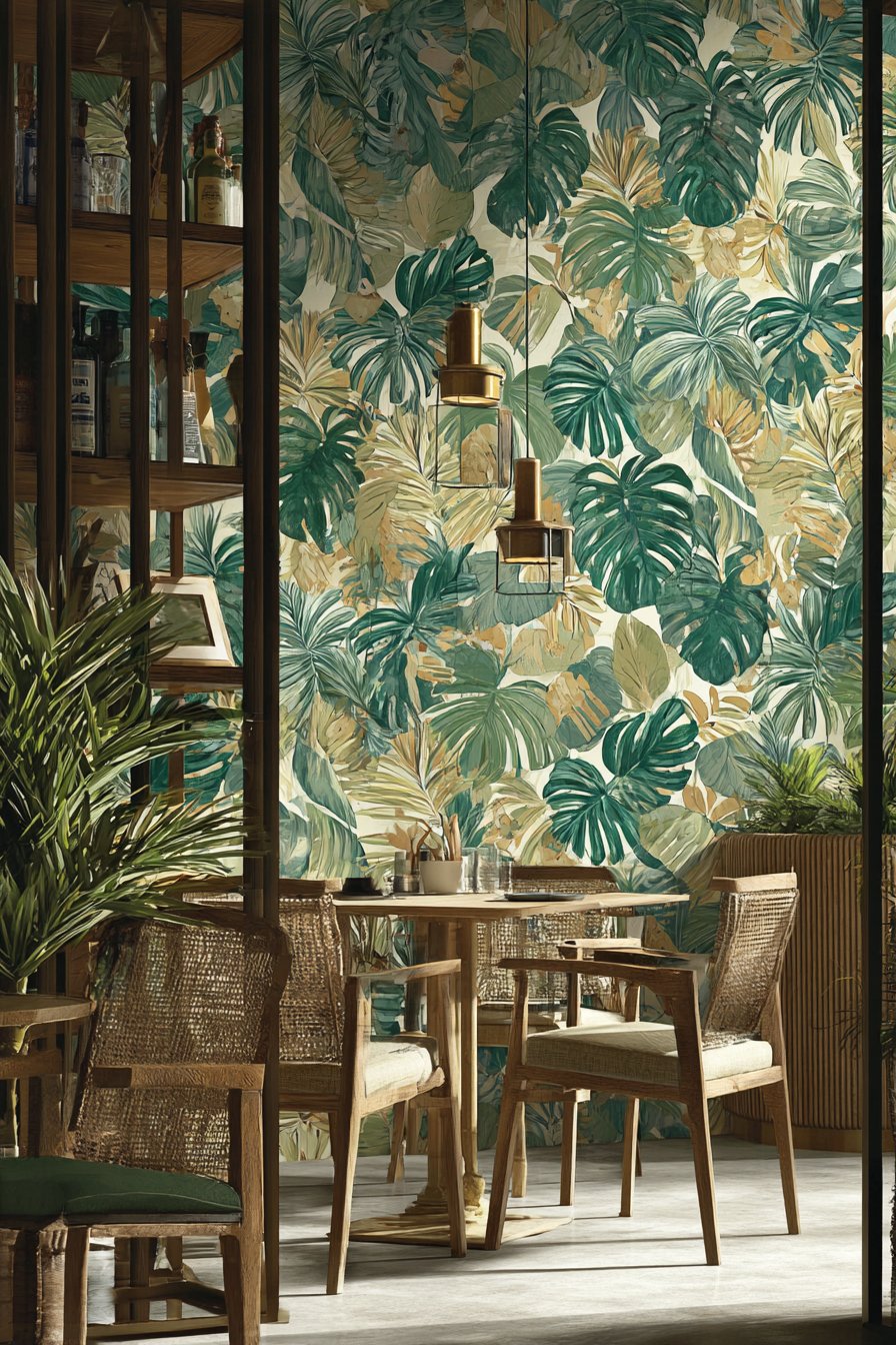Bold graphic wallpaper featuring oversized tropical leaf patterns in deep greens and gold on cream backgrounds creates lush, immersive environments that transport diners to exotic destinations. The large-scale botanical patterns add immediate visual impact and establish strong thematic identity for restaurants focusing on tropical cuisine, Caribbean flavors, or vacation-inspired dining concepts. Natural rattan furniture and brass pendant lights extend the tropical aesthetic through materiality and finish, creating cohesive environments where every element reinforces the central theme.