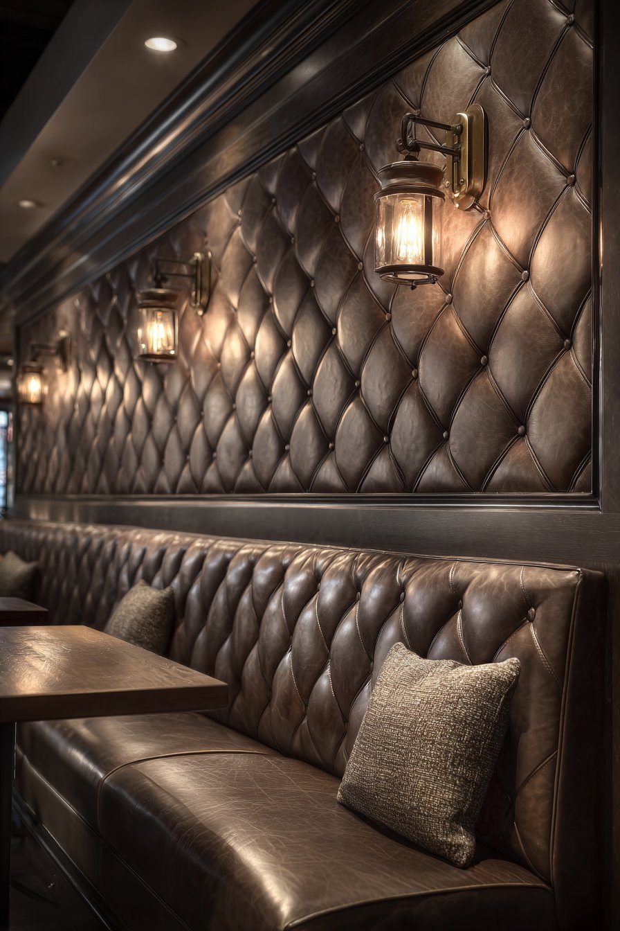A metallic tile installation using brushed stainless steel subway tiles creates ultra-modern, reflective surfaces that amplify light throughout dining spaces while delivering contemporary edge. The sleek tiles contrast effectively with warm wood furniture and soft textile elements, balancing industrial modernity with organic warmth. LED strip lighting installed at ceiling lines creates subtle glow across metallic surfaces, emphasizing the tiles’ dimensional quality and reflective properties.