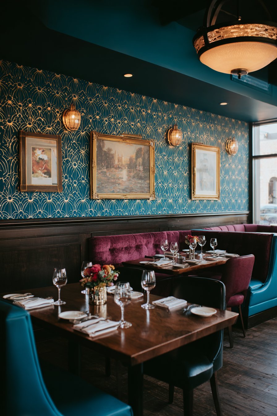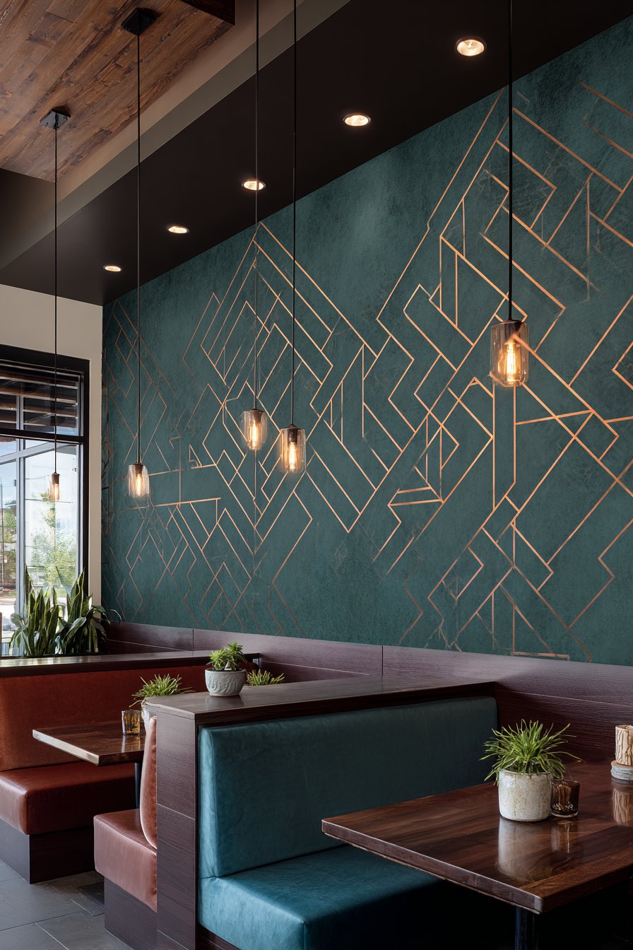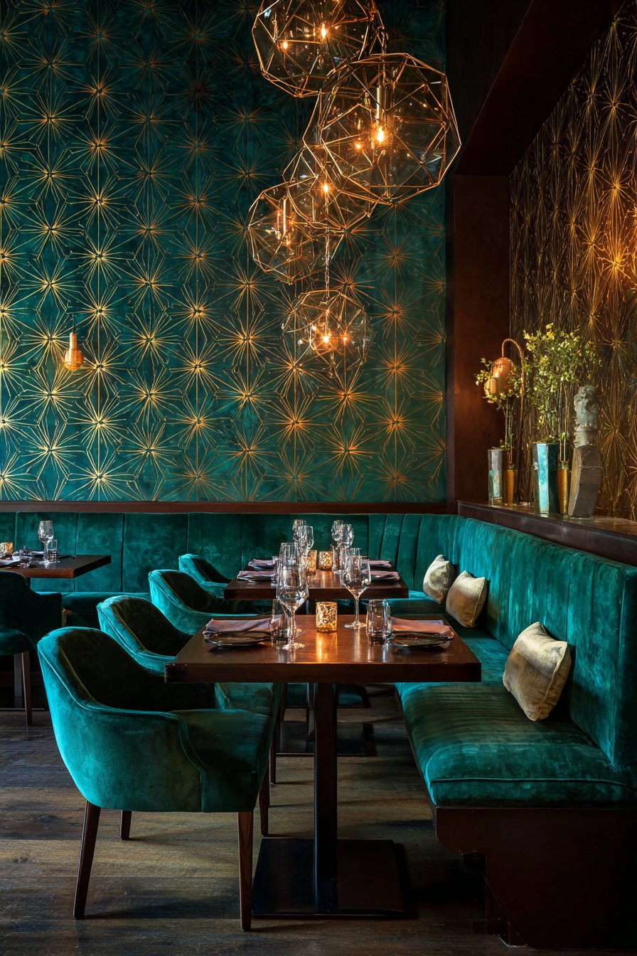 Contemporary geometric wallpaper in deep emerald green with gold metallic accents creates an instantly luxurious atmosphere that transports diners into a refined, glamorous environment reminiscent of 1920s elegance. The bold pattern covering a feature wall makes an unambiguous design statement that establishes the restaurant’s commitment to sophisticated aesthetics and attention to detail. When combined with warm brass light fixtures that echo the wallpaper’s metallic elements and dark wood wainscoting that provides visual grounding, the composition achieves the balanced opulence characteristic of art deco design.