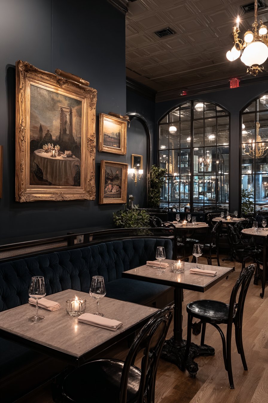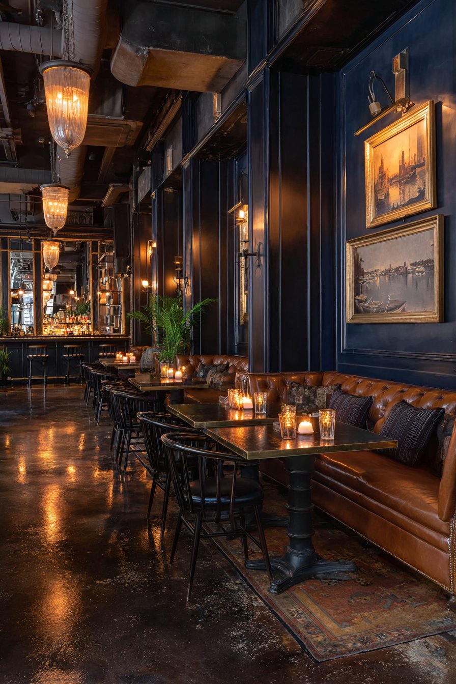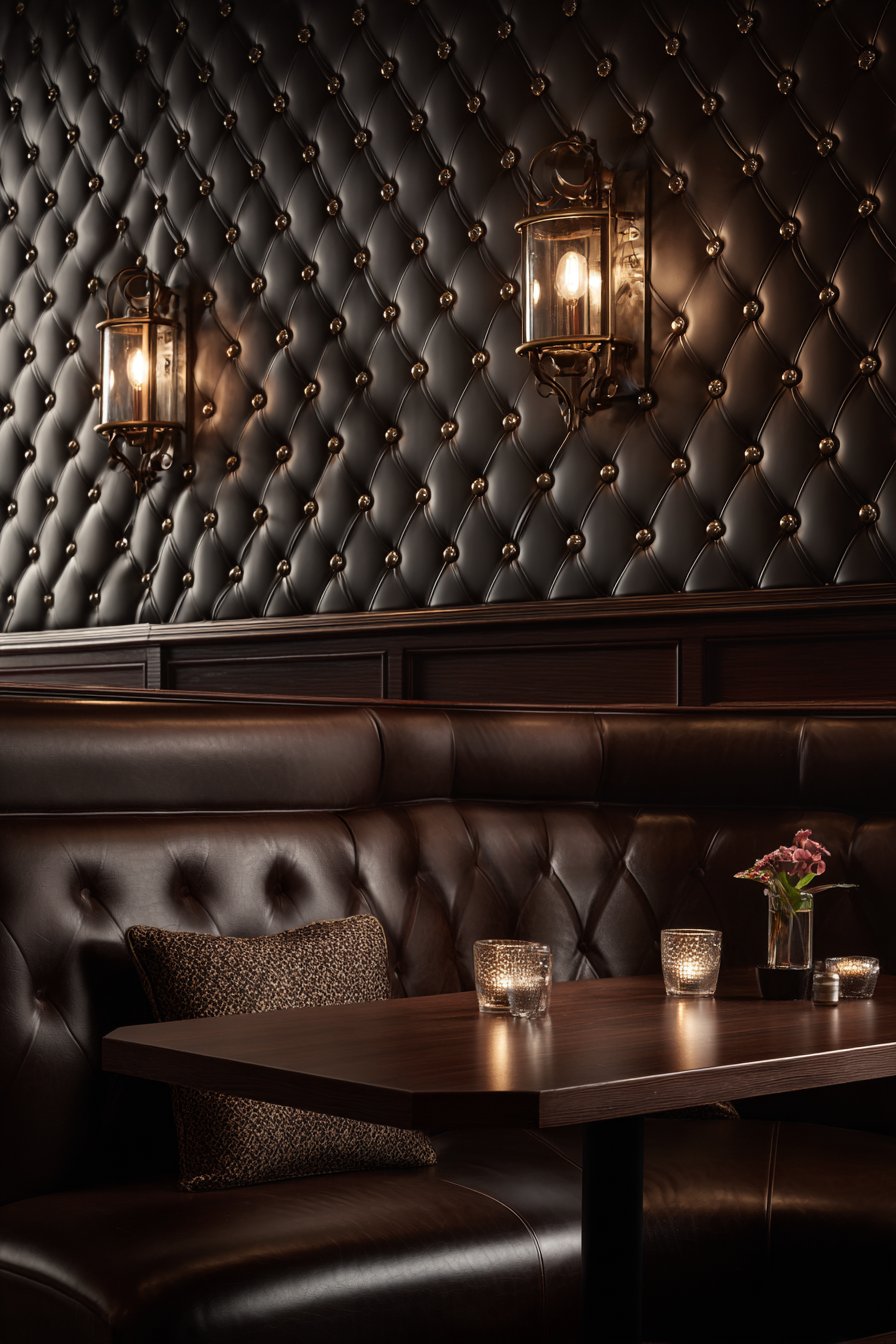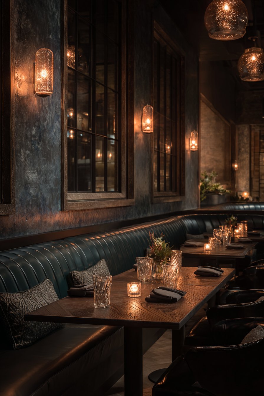 Contemporary geometric wallpaper in deep emerald green with gold metallic accents creates an instantly luxurious atmosphere that transports diners into a refined, glamorous environment reminiscent of 1920s elegance. The bold pattern covering a feature wall makes an unambiguous design statement that establishes the restaurant’s commitment to sophisticated aesthetics and attention to detail. When combined with warm brass light fixtures that echo the wallpaper’s metallic elements and dark wood wainscoting that provides visual grounding, the composition achieves the balanced opulence characteristic of art deco design.