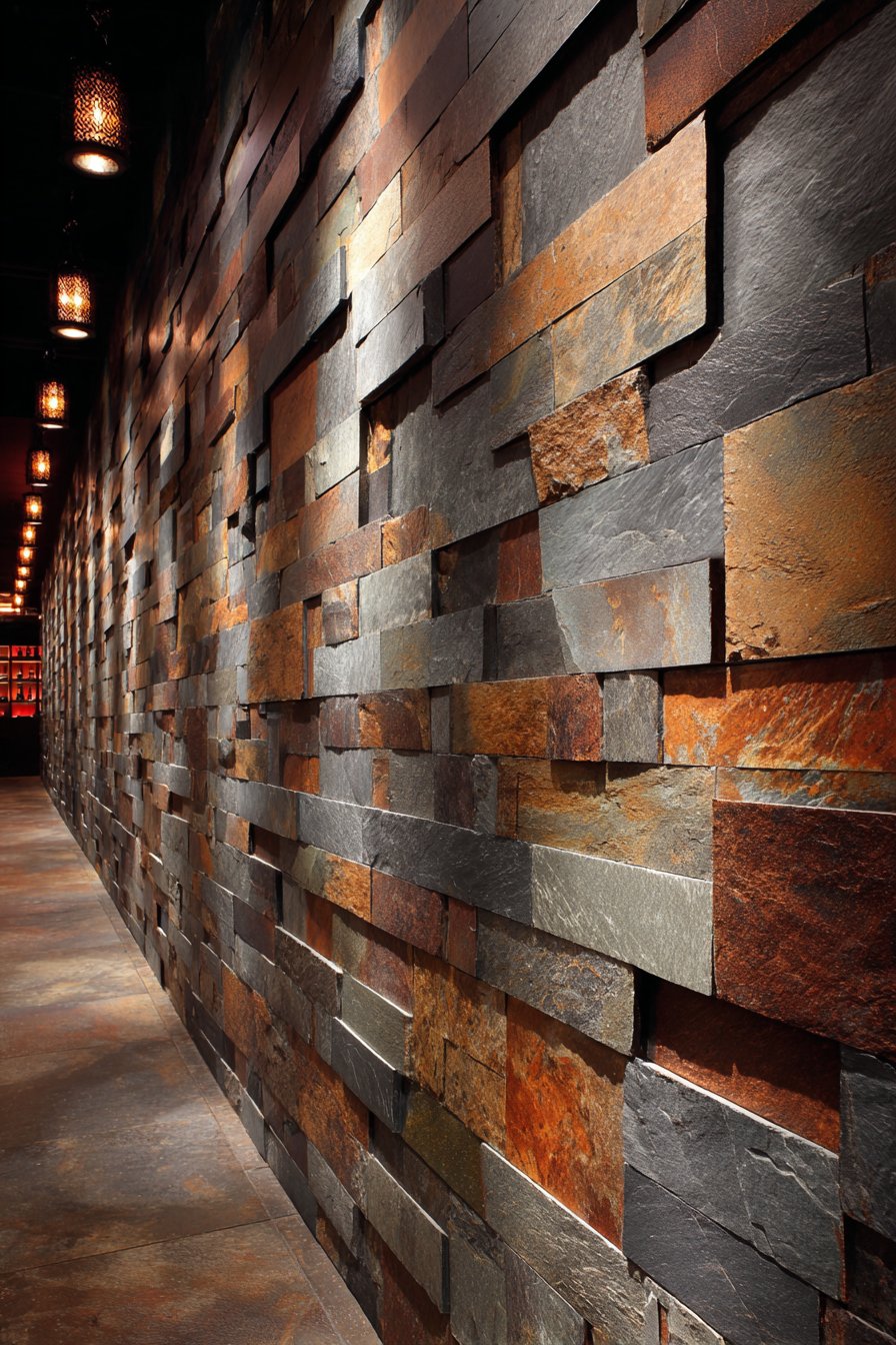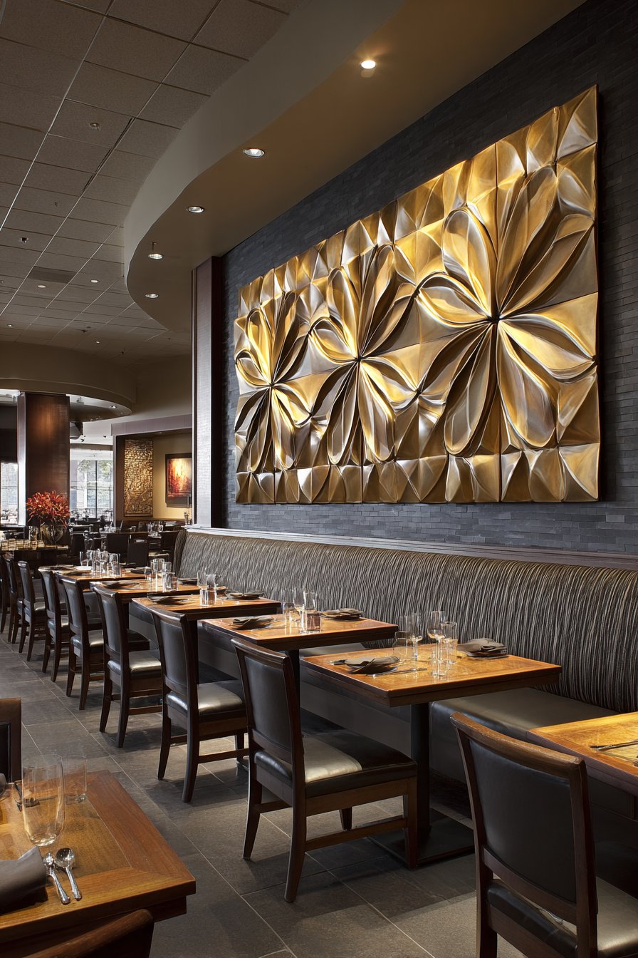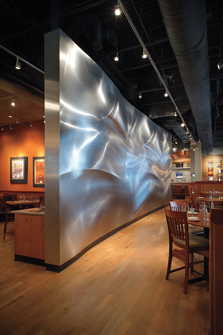 Professional photography demonstrates how the restaurant wall design idea adds contemporary sophistication while maintaining warmth through material balance, captured with careful exposure control showing tiles’ subtle reflections without glare or hotspots. The stainless steel provides exceptional durability and hygienic properties particularly appropriate for areas visible from open kitchens or exhibition cooking stations. The reflective quality also multiplies perceived space and light, valuable in smaller dining rooms or spaces with limited natural light.