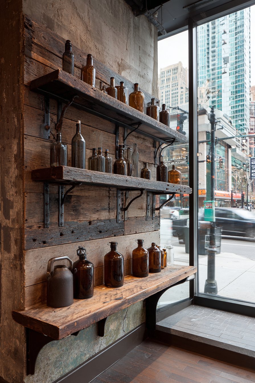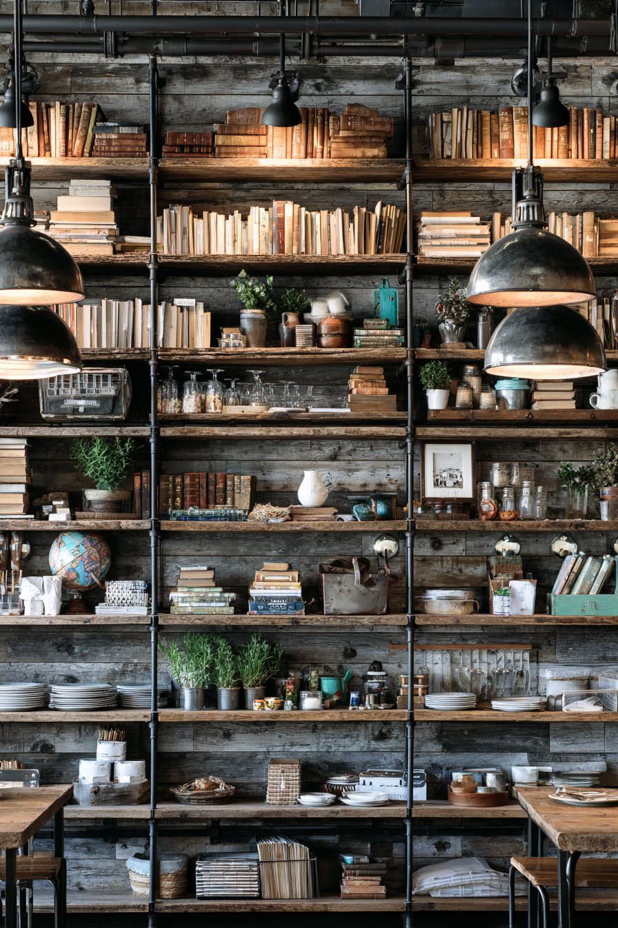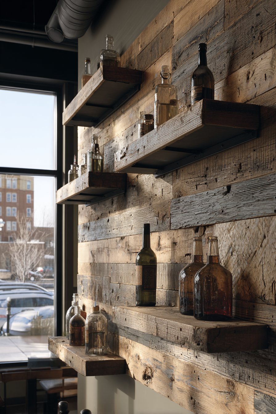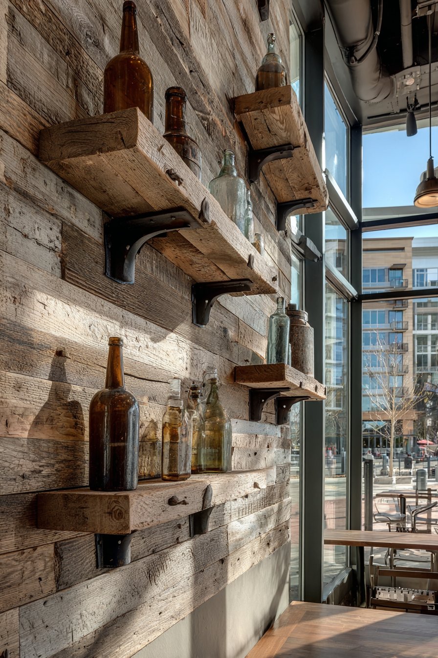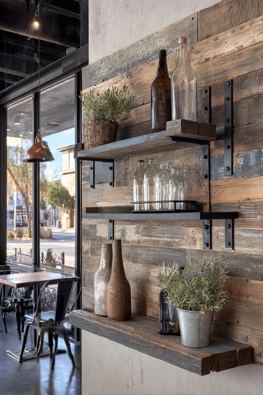 The textural quality of reclaimed wood offers exceptional versatility in restaurant settings. The material reads as warm and approachable, softening contemporary interiors that might otherwise feel too sleek or cold, while simultaneously providing structural visual weight that grounds more eclectic or bohemian designs. Black metal shelf brackets supporting floating shelves create functional display opportunities for curated decorative elements—vintage industrial artifacts, artisanal bottles, potted plants, or rotating seasonal displays that keep the wall treatment fresh and engaging across multiple visits.