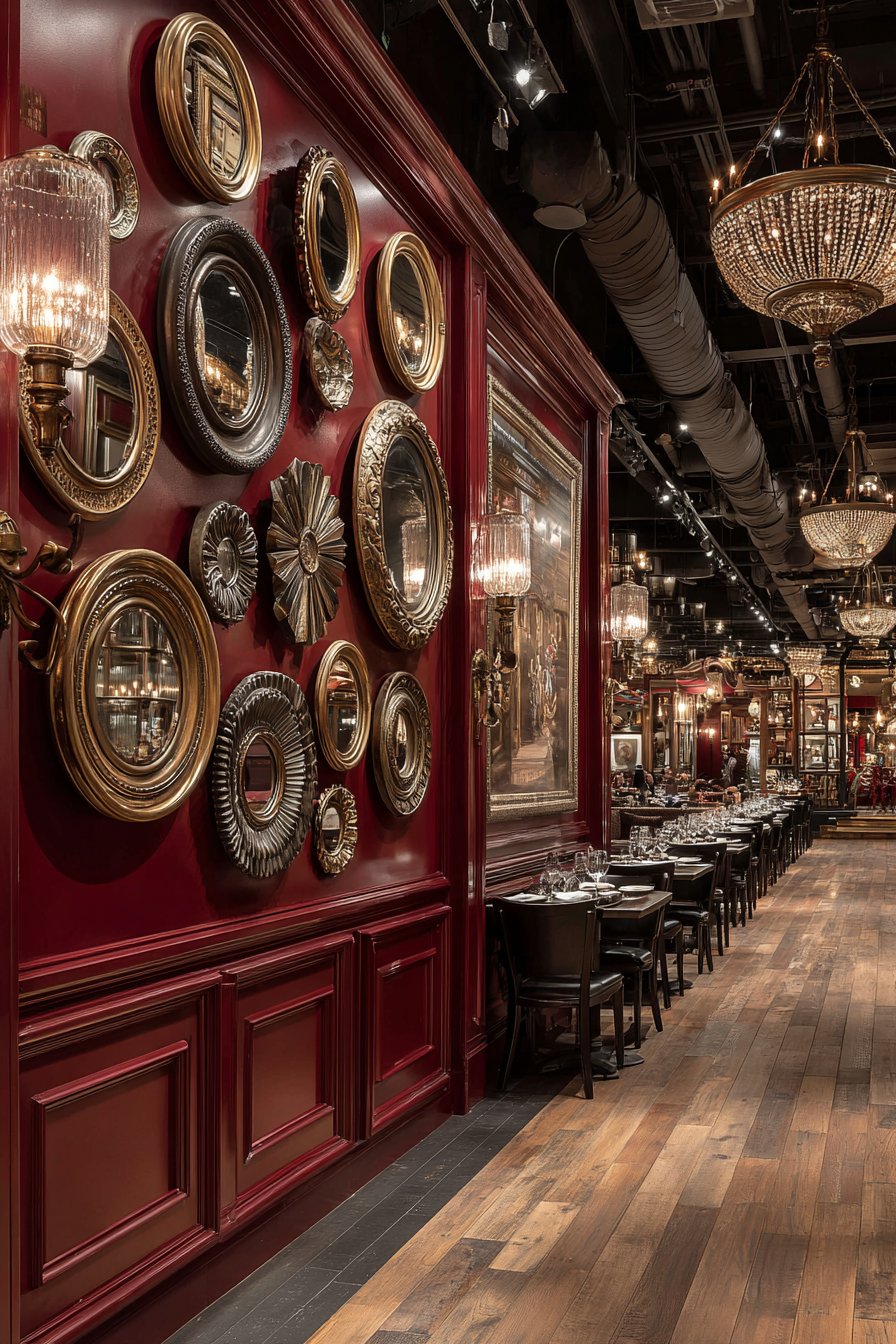 Professional interior photography demonstrates how the restaurant wall design idea adds glamour and light multiplication to intimate dining spaces, captured with balanced exposure showing both reflected and direct light sources. The burgundy wall color provides dramatic backdrop that makes metallic frames pop visually while creating enveloping, sophisticated atmosphere particularly suited to evening dining. The multiple reflections create spatial complexity and visual interest that rewards extended viewing during multi-course meals.