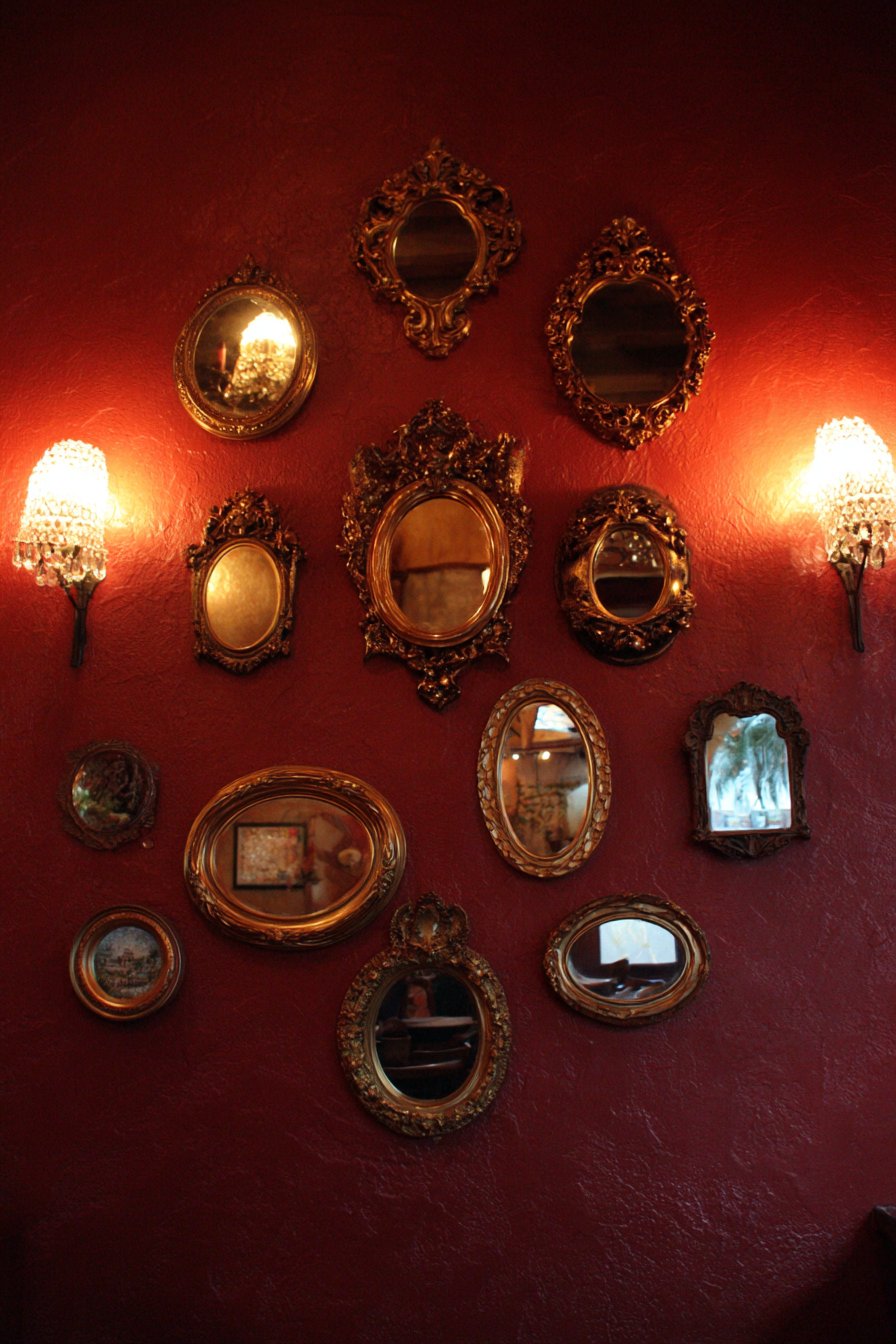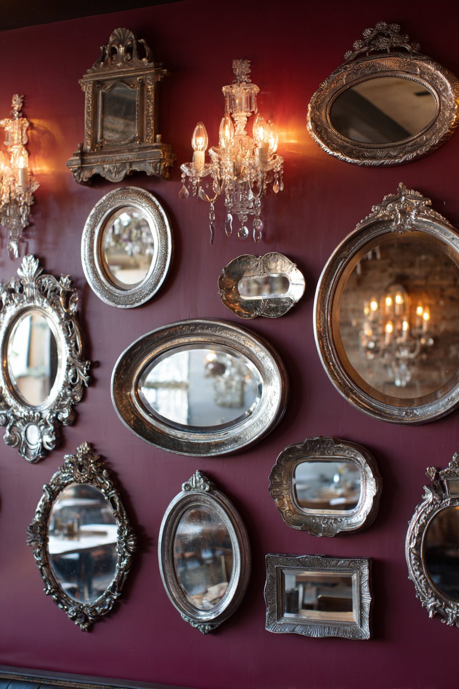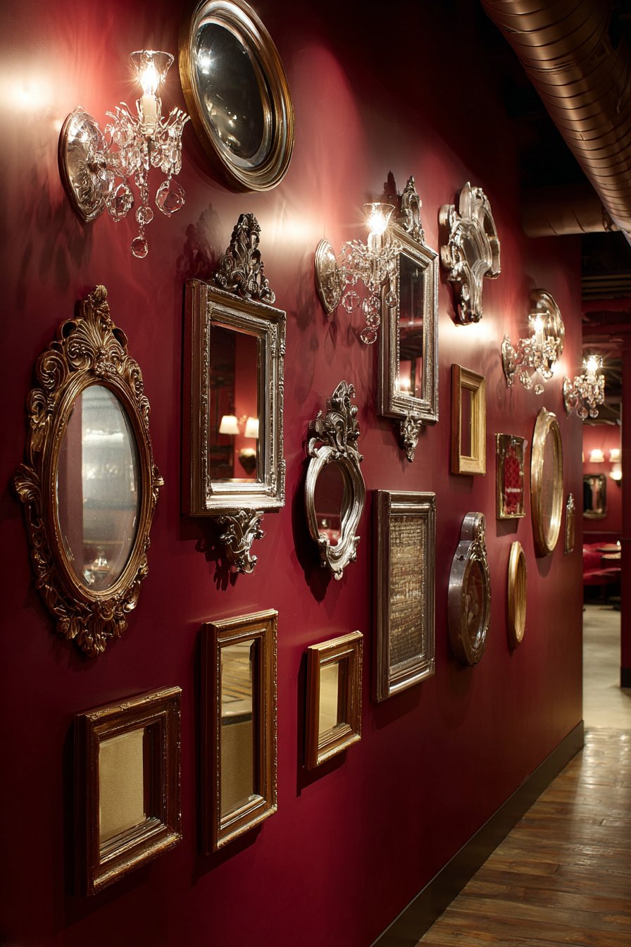 A collection of ornate vintage mirrors in mixed metallic finishes including gold, silver, and bronze creates glamorous, light-multiplying installation when arranged in eclectic cluster on deep burgundy painted walls. The mirrors vary in size and style from baroque to art deco, creating visual intrigue through reflection multiplication and stylistic diversity. Crystal sconces add sparkle and ambient lighting while complementing the mirrors’ ornate detailing and metallic finishes.
