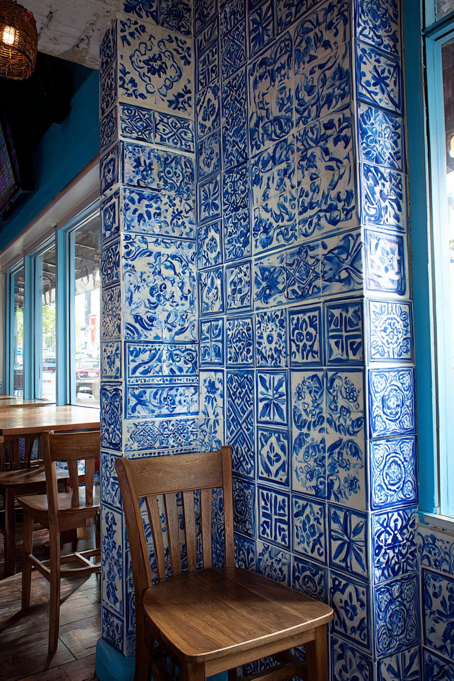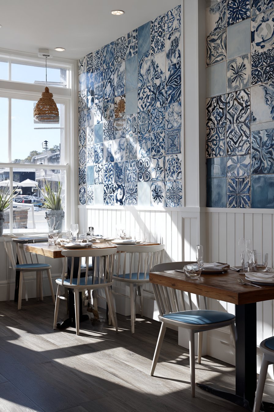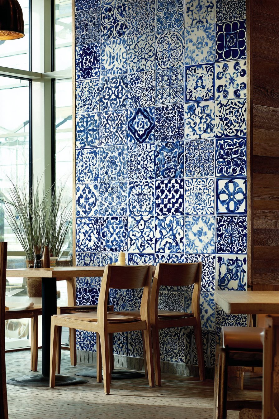 Hand-painted decorative tiles in traditional Portuguese azulejo patterns create authentic Mediterranean atmosphere through intricate geometric and floral motifs in classic blue and white color schemes. The glazed tile surface covering one feature wall provides cultural authenticity while offering exceptional durability and easy maintenance appropriate for commercial restaurant environments. Simple wooden chairs and tables complement the ornate tilework without competing visually, allowing the tiles’ detailed patterns to remain focal points.