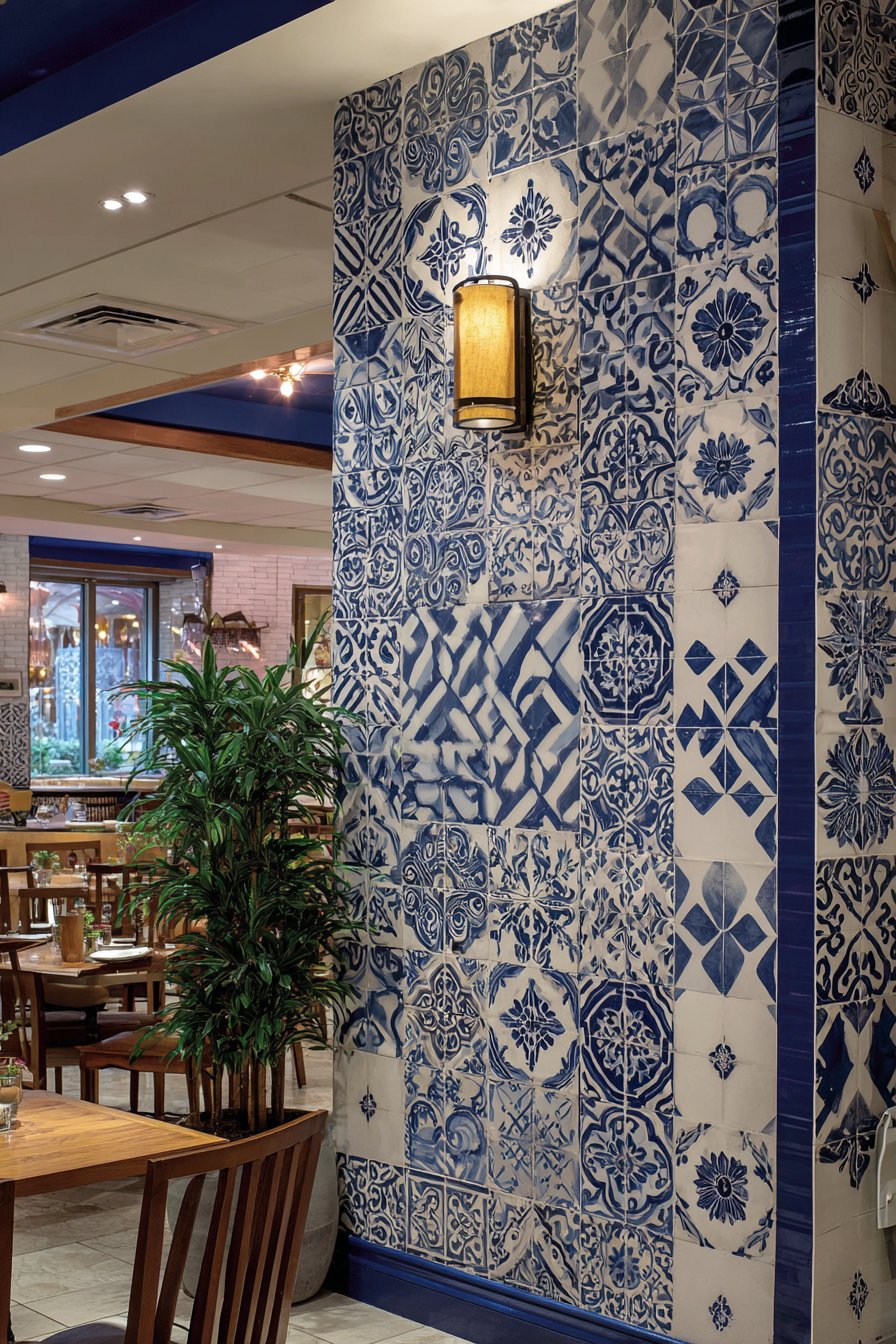 Natural light from windows highlights the glazed tile surface, creating subtle reflections and emphasizing the hand-painted patterns’ slight variations that indicate artisanal craftsmanship. Interior design photography captures the restaurant’s cultural aesthetic with the restaurant wall design idea providing authentic charm that transports diners to Portuguese cafés and coastal villages. The blue and white color scheme creates fresh, clean impressions while remaining timeless and avoiding trendy aesthetics that might date quickly.