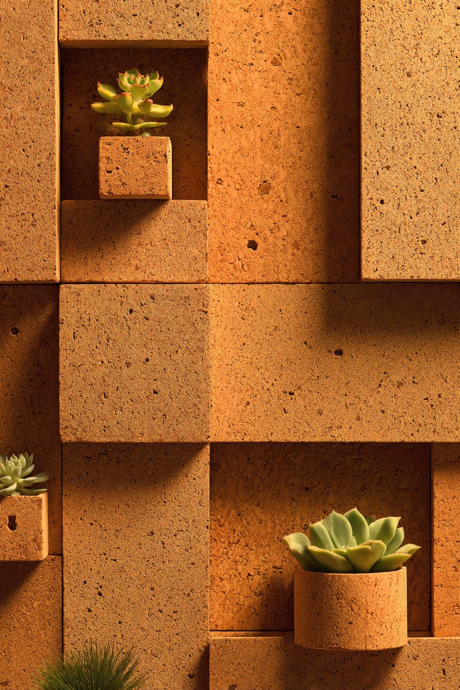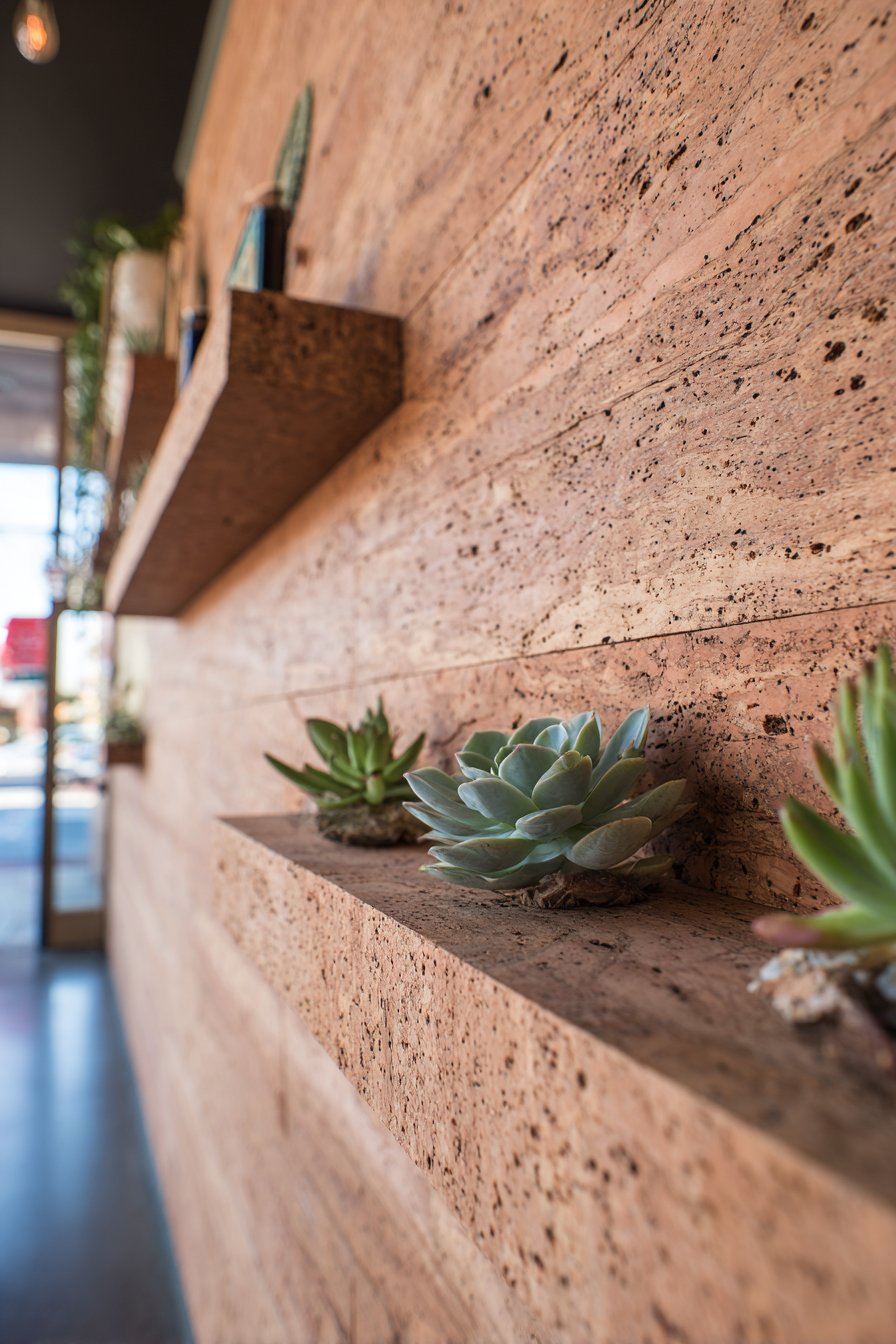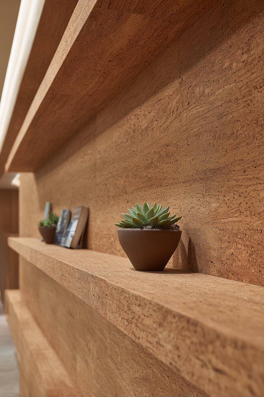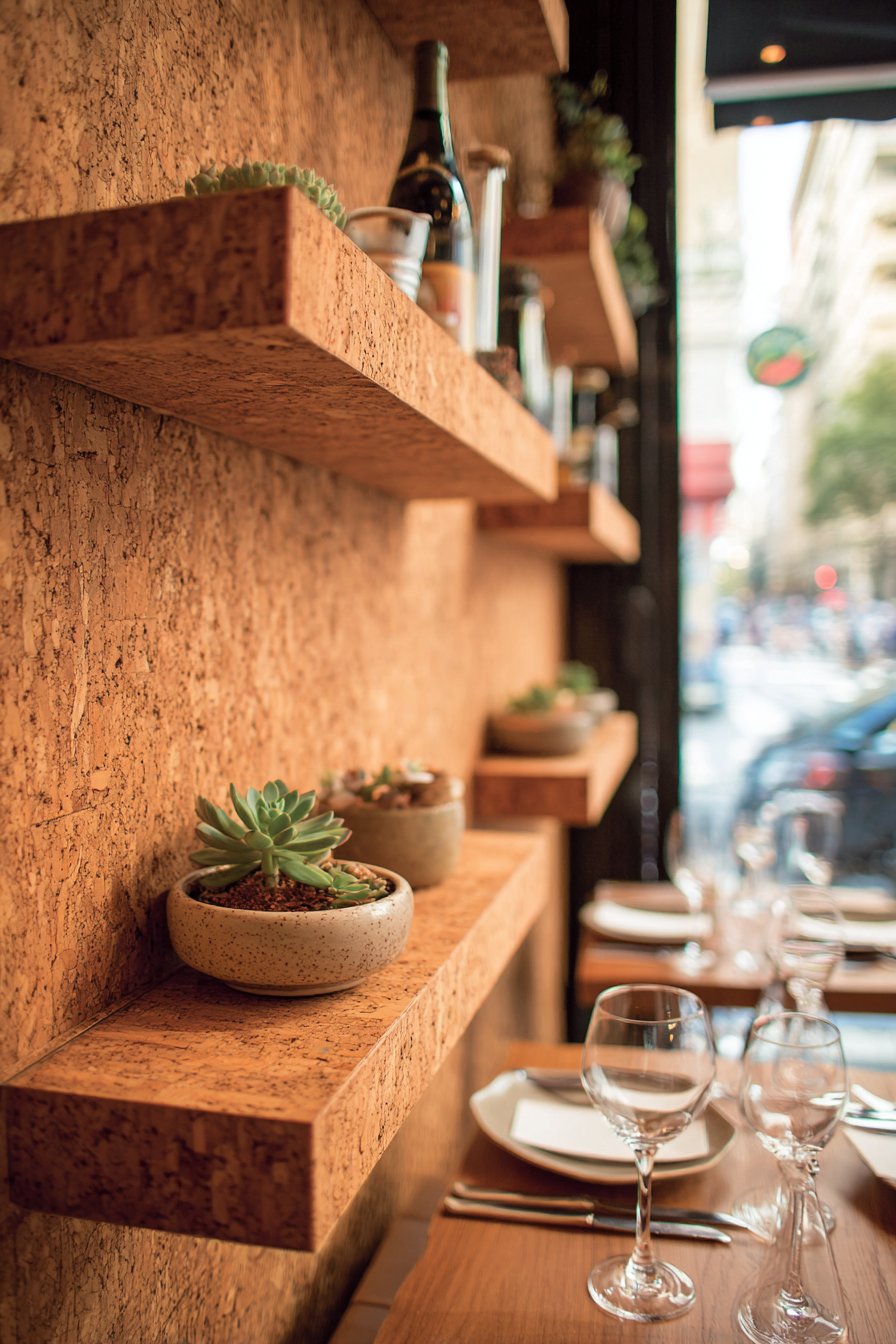 Modern cork wall installation using large-format cork panels in natural honey tones creates warm, sustainable, and acoustic-friendly surfaces that align with contemporary environmental values. The cork’s organic texture provides visual interest through natural grain patterns while absorbing sound to improve conversation quality in busy dining areas. Simple floating shelves in matching cork hold small succulents, extending the natural material vocabulary while adding living elements that enhance biophilic design principles.