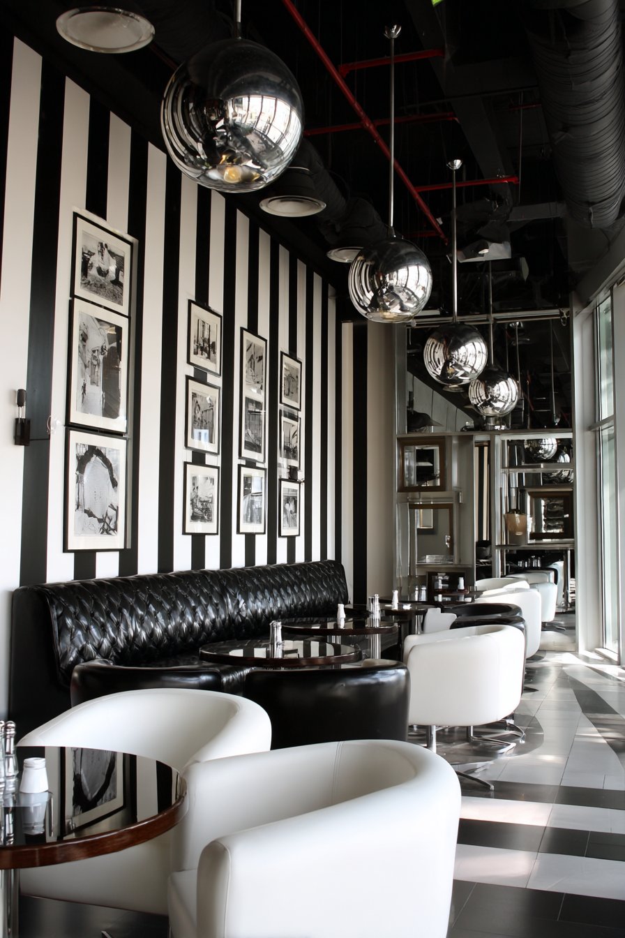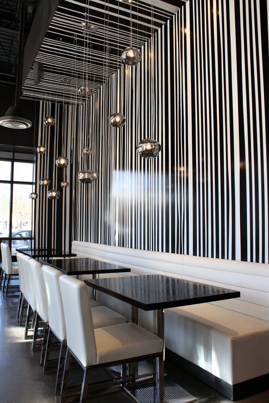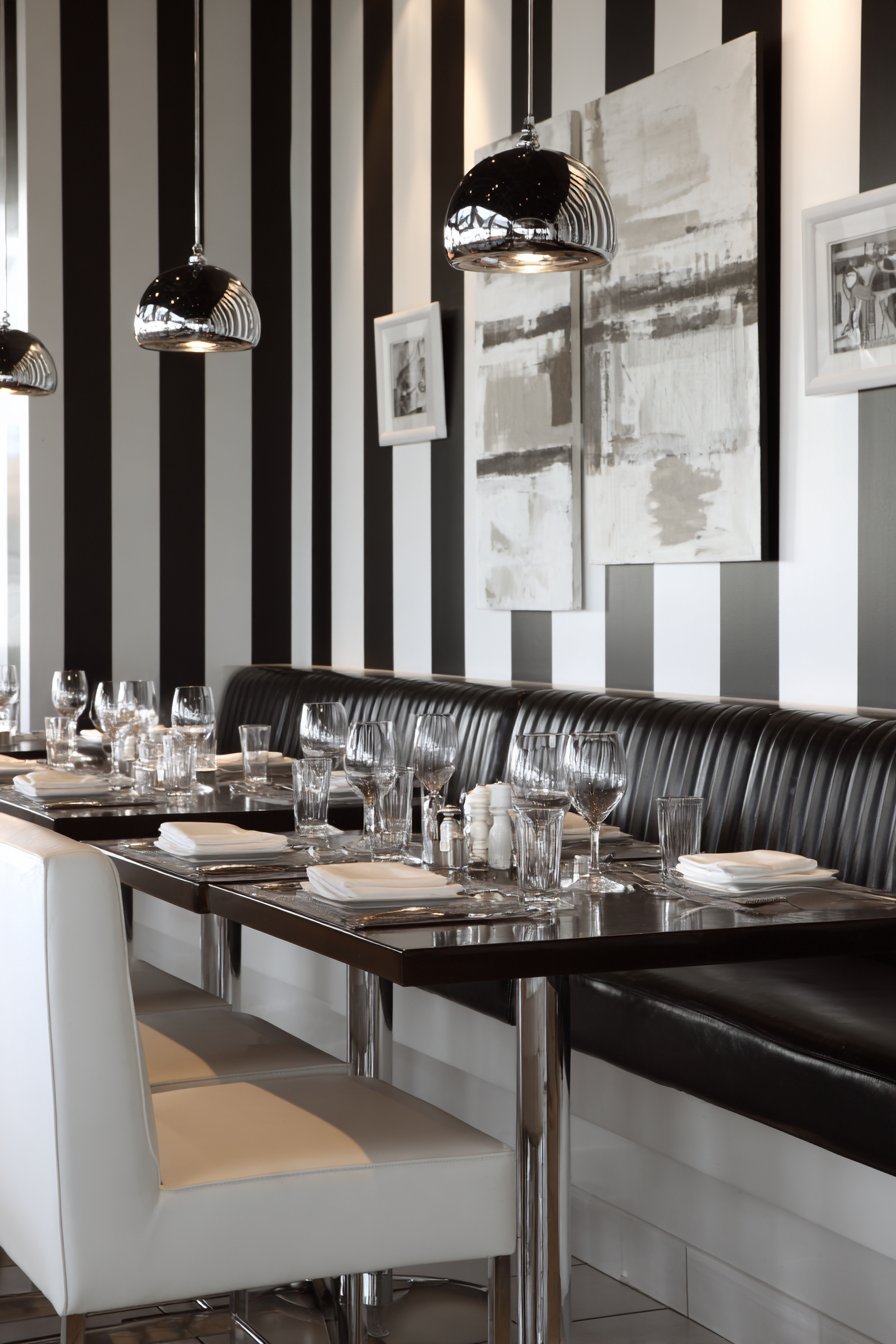 This wall treatment makes strong design statements that distinguish restaurants from competitors while creating memorable visual experiences that aid brand recognition and recall. The stripes can be oriented vertically to increase perceived height or horizontally to expand perceived width, providing flexibility based on specific spatial challenges. The timeless black and white palette ensures the bold pattern remains sophisticated rather than trendy, supporting longevity despite strong visual impact.