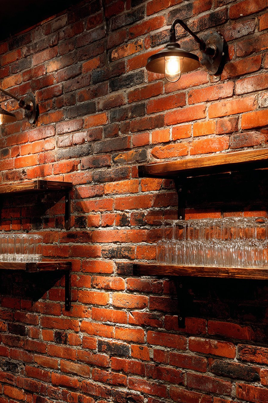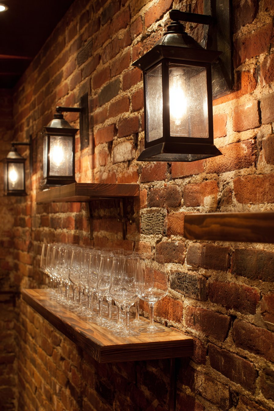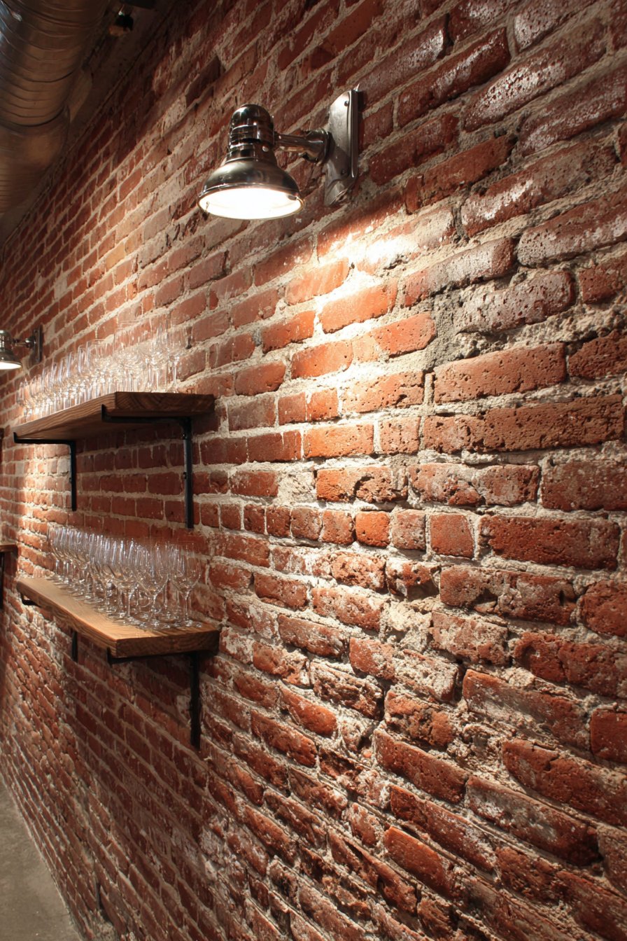 Exposed brick that has been carefully restored and sealed maintains authentic industrial character while meeting commercial building requirements for cleanliness and durability. The preservation of visible mortar lines and natural color variations from deep red to orange-brown celebrates architectural history while providing warm, textured backdrop. Vintage industrial lighting fixtures mounted directly to brick provide task and ambient lighting while emphasizing the wall’s authentic character.