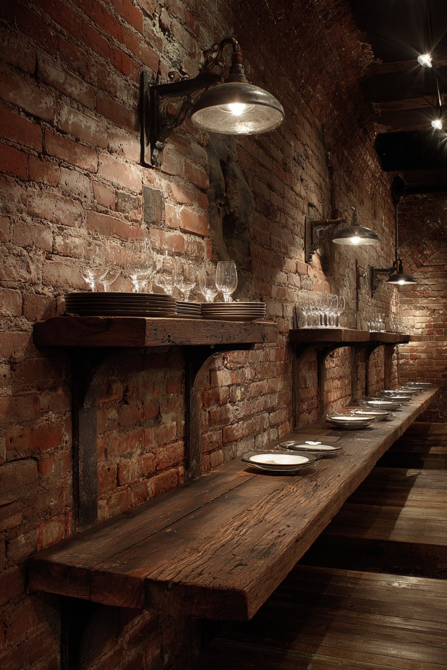 Simple metal shelf brackets supporting wooden shelves create functional display opportunities for wine glasses, bottles, or decorative objects without concealing the brick’s appeal. Interior photography demonstrates how the restaurant wall design idea celebrates architectural history while providing warm atmosphere, captured with lighting that enhances the brick’s dimensional quality and aged patina. The exposed brick communicates authenticity, permanence, and connection to building history that resonates with guests seeking genuine rather than manufactured character.