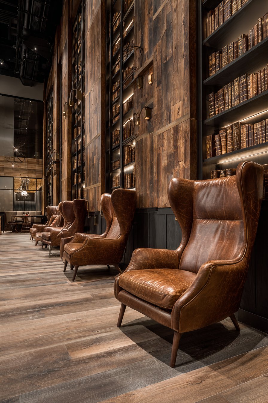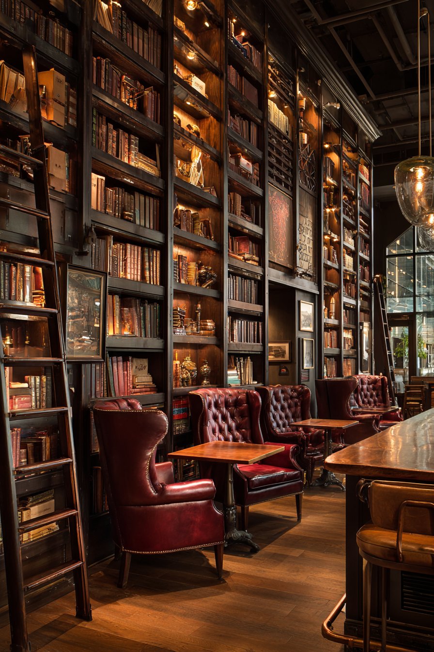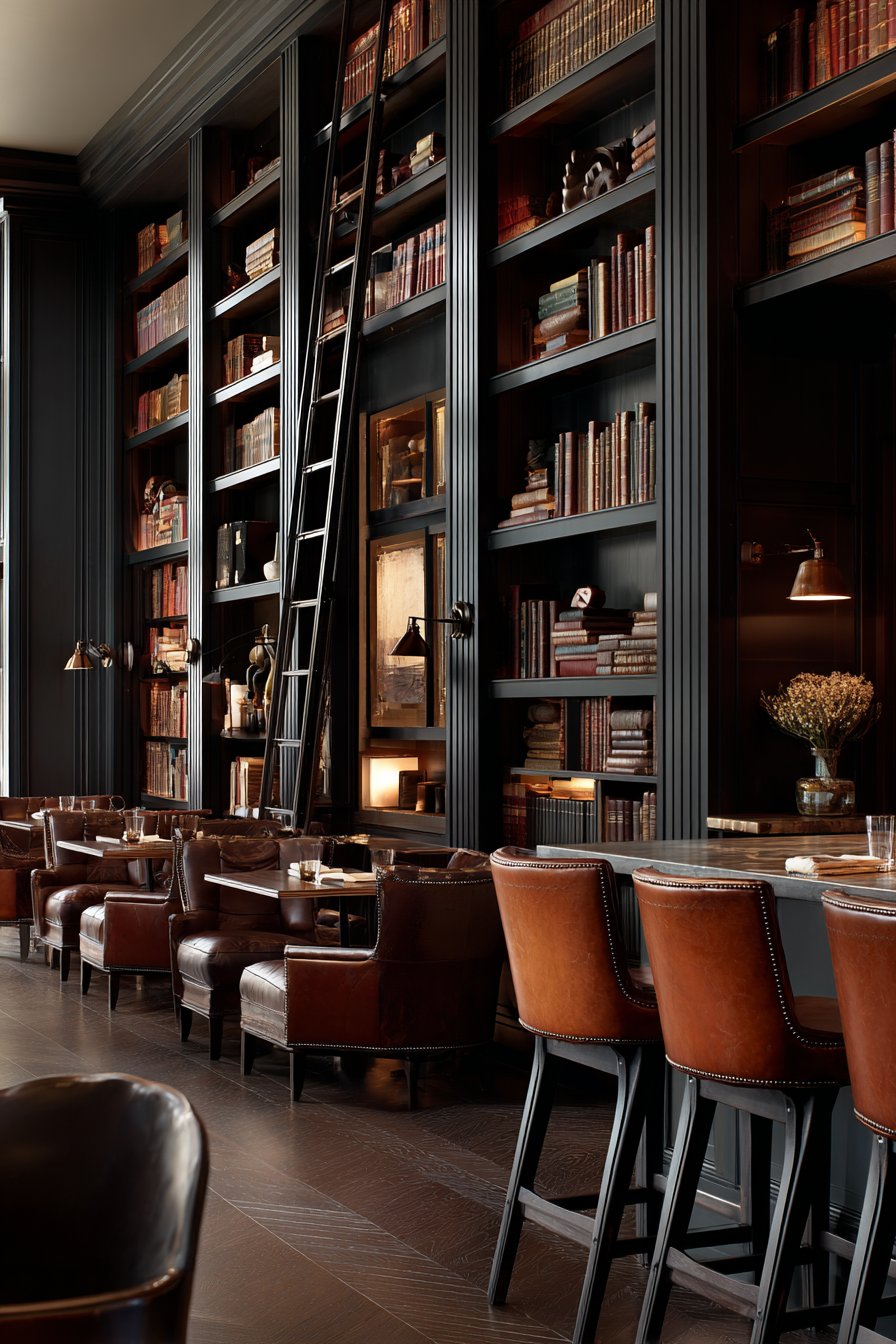 Custom-built bookshelf wall filled with vintage books, decorative objects, and subtle integrated lighting creates sophisticated library-like atmosphere that elevates dining to intellectual pursuit. The floor-to-ceiling built-in shelving in dark stained wood includes ladder access rails and brass library lights creating authentic library detailing. Leather wingback chairs positioned in front of bookshelf walls extend the intellectual aesthetic while providing comfortable waiting or lounge seating.