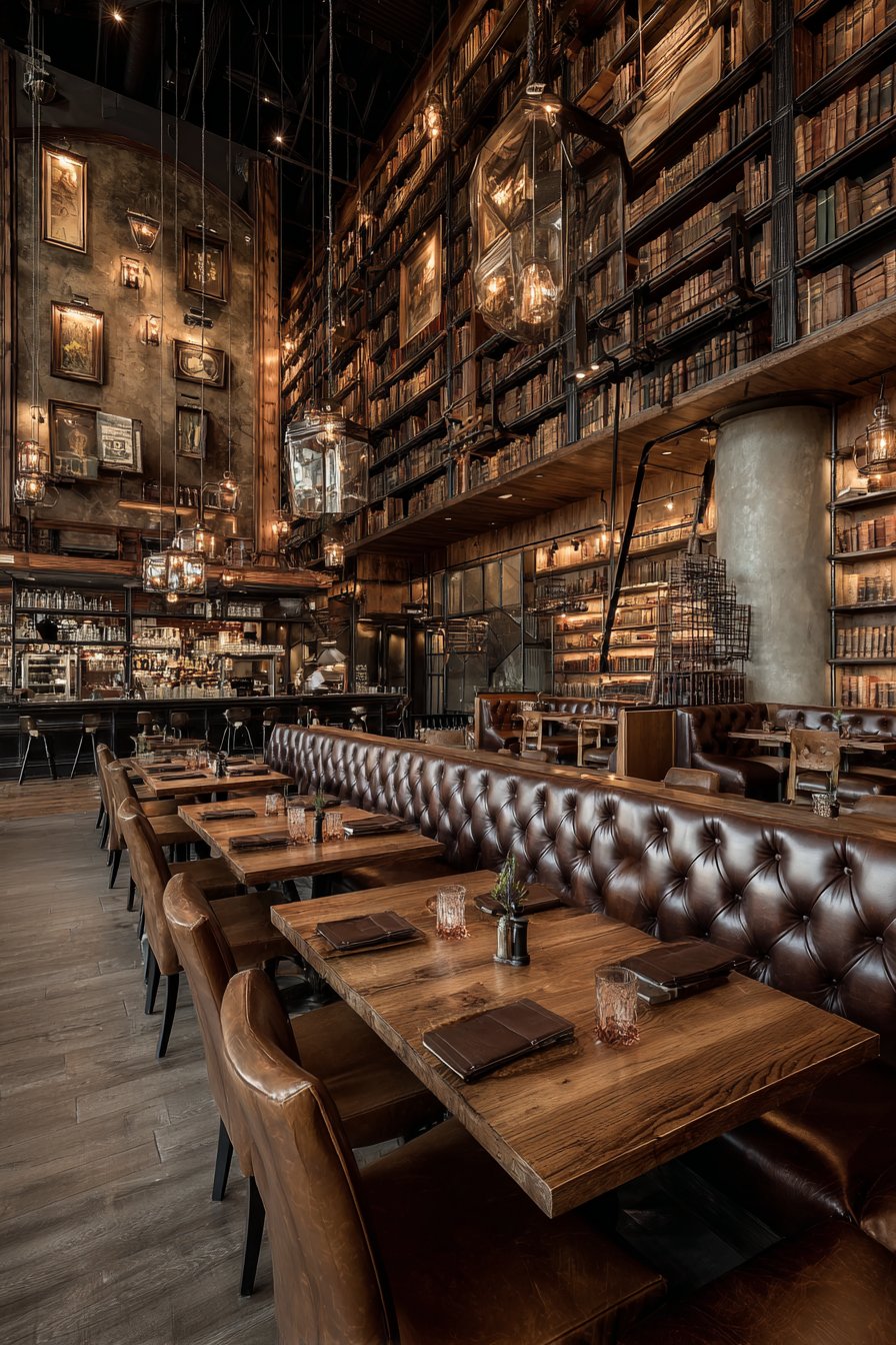 Wide-angle interior design photography shows how the restaurant wall design idea transforms dining space into intellectual retreat, captured with warm lighting that highlights leather book spines and creates cozy reading nook atmosphere. The bookshelf wall works particularly well in hotel restaurants, wine bars, after-dinner cognac lounges, and establishments targeting sophisticated demographics who appreciate literary culture. The books can include actual culinary references, wine guides, and local history adding functional value beyond pure decoration.