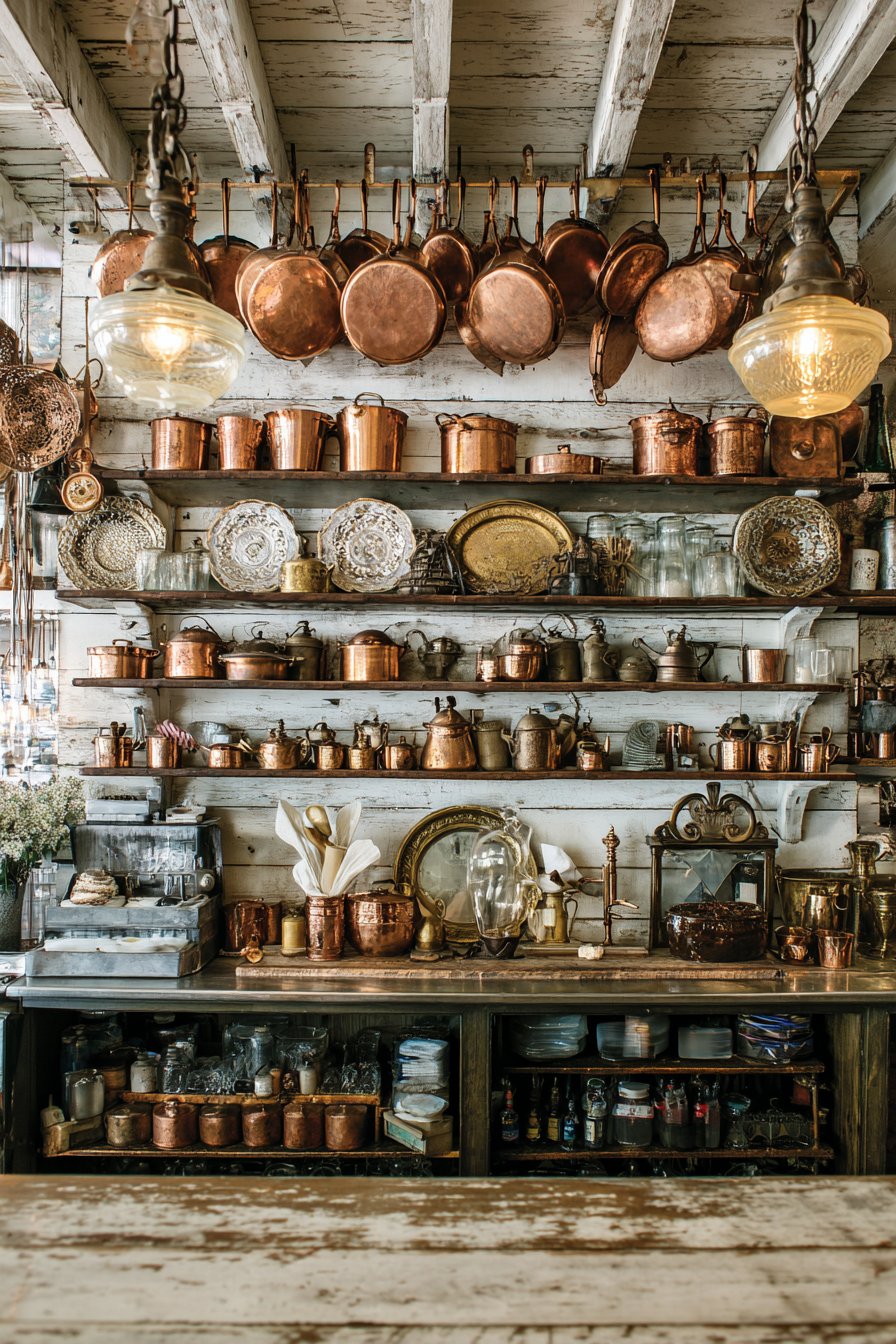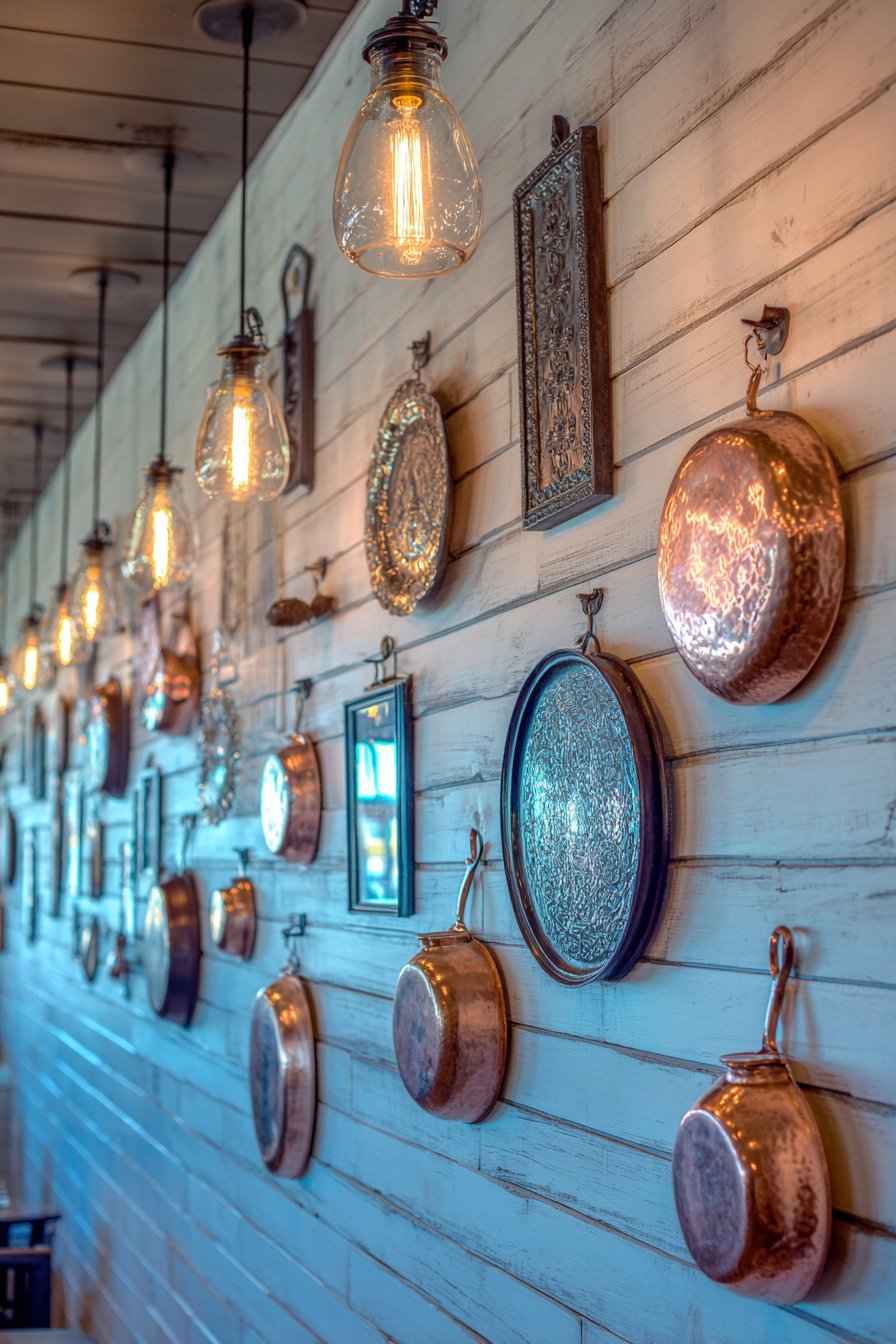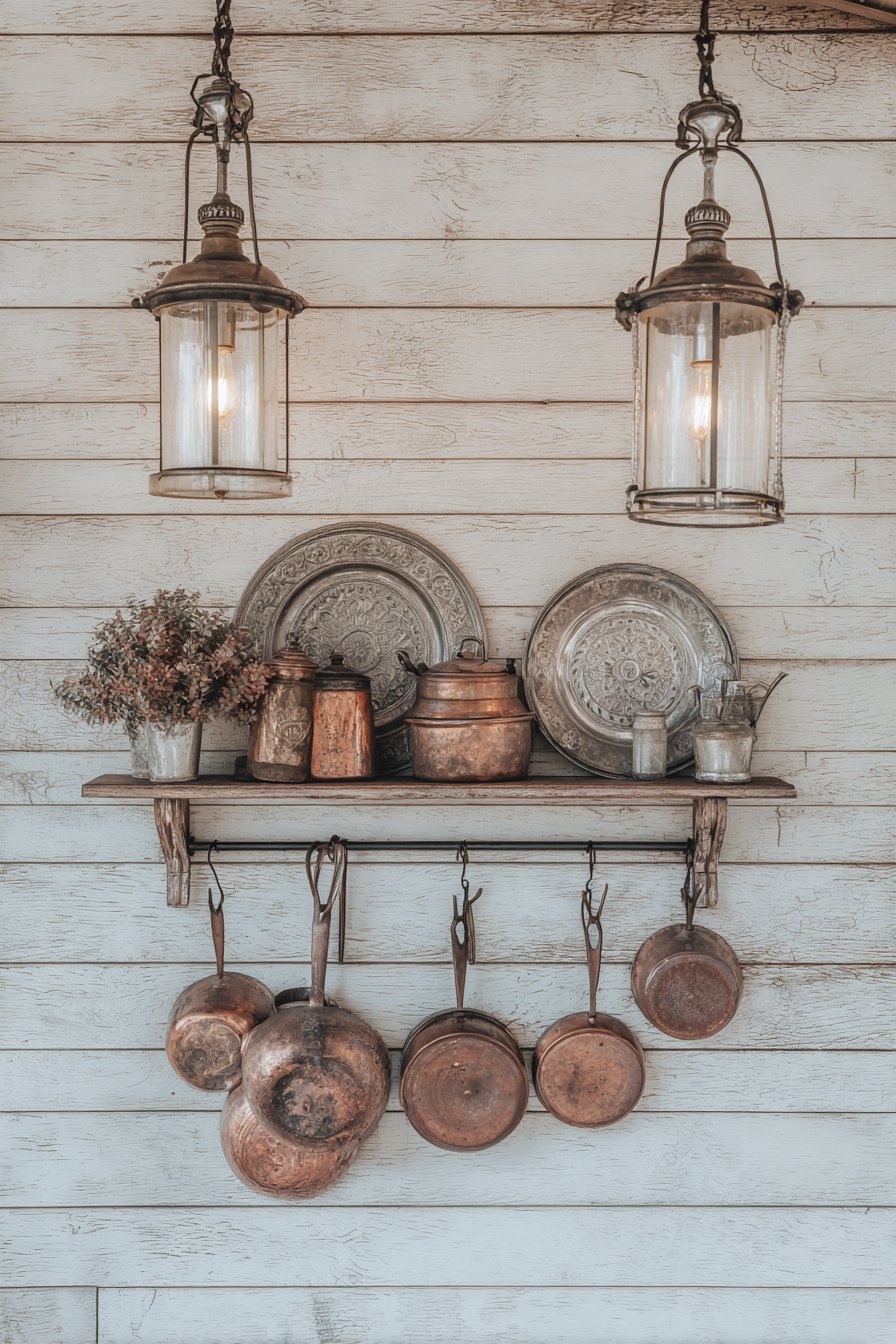A curated display of antique serving platters, copper pots, and vintage kitchen implements mounted on whitewashed shiplap walls creates country-kitchen aesthetic celebrating culinary tradition. The functional items become decorative art arranged in organized yet organic patterns that appear collected over time rather than purchased as coordinated sets. Farmhouse-style pendant lights with seeded glass shades illuminate the collection while reinforcing the rustic-traditional design vocabulary.