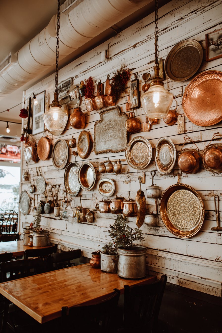 Interior design photography captures the restaurant’s country-kitchen aesthetic with the restaurant wall design idea celebrating culinary heritage, showing natural lighting that highlights copper’s warm patina and items’ authentic age. The whitewashed shiplap provides neutral backdrop that allows the copper and ceramic pieces’ colors and forms to stand out while adding textural interest through wood grain. The arrangement communicates values of tradition, craftsmanship, and respect for culinary history that resonate with guests seeking authentic rather than manufactured dining experiences.