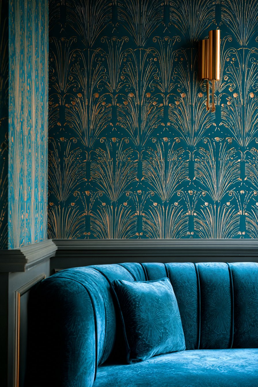 The strategic application of patterned wallpaper as a feature wall rather than throughout the entire space prevents visual overwhelm while creating clear focal points that organize the room and guide traffic flow. Velvet upholstered banquette seating in coordinating jewel tones—perhaps sapphire blue, deep ruby, or rich amethyst—extends the luxurious material palette while providing textural variation that prevents the space from feeling one-dimensional. The reflective quality of the metallic pattern elements interacts dynamically with both natural daylight and artificial evening lighting, creating a wall surface that appears to shift and shimmer as light conditions change.
